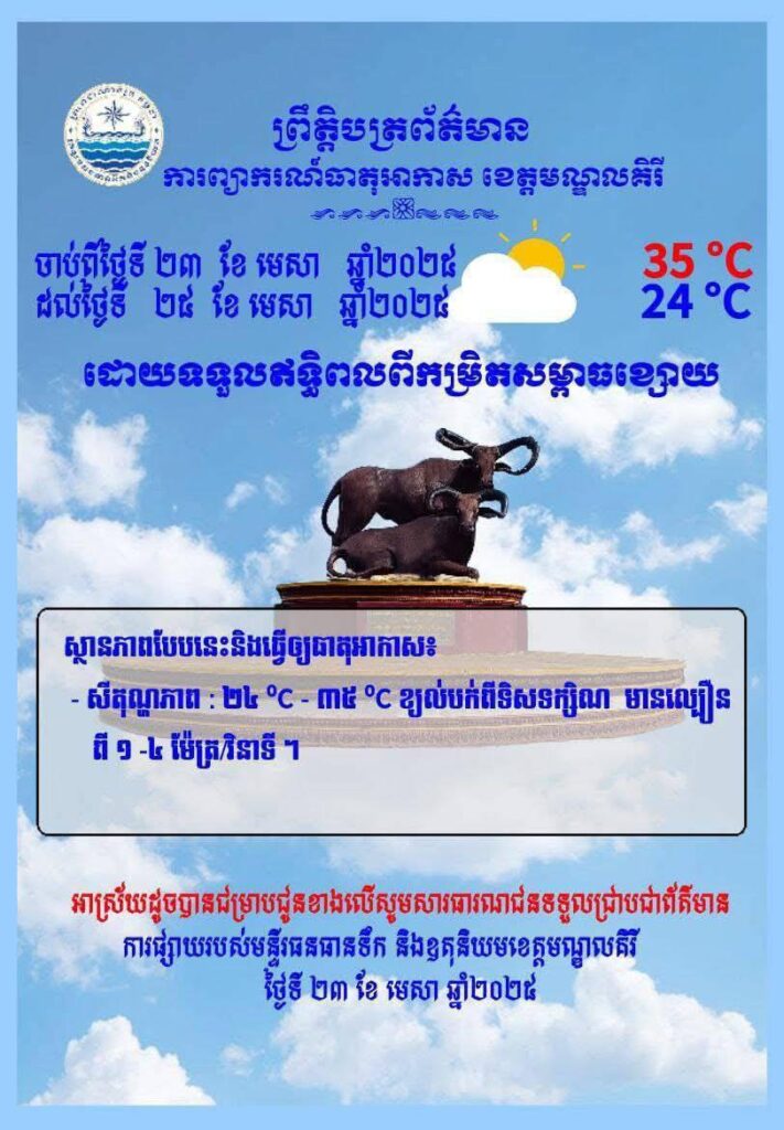 ការព្យាករអាកាសធាតុរបស់មន្ទីរធនធានទឹកនិងឧតុនិយមខេត្តមណ្ឌលគិរីបានបង្ហាញថា ខេត្តមណ្ឌលគិរី ចាប់ពីថ្ងៃទី២៣ ដល់ថ្ងៃទី២៥ ខែមេសា ឆ្នាំ២០២៥ «ដោយទទួលឥទ្ធិពលពីកម្រិតសម្ពាធខ្សោយ» ស្ថានភាពបែបនេះ នឹងធ្វើឱ្យធាតុអាកាសមានសីតុណ្ហភាព:ពី២៤°C -៣៥ °C និងមានខ្យល់បក់ពីទិសទក្សិណ មានល្បឿនពី ១-៤ ម៉ែត្រ/វិនាទី៕