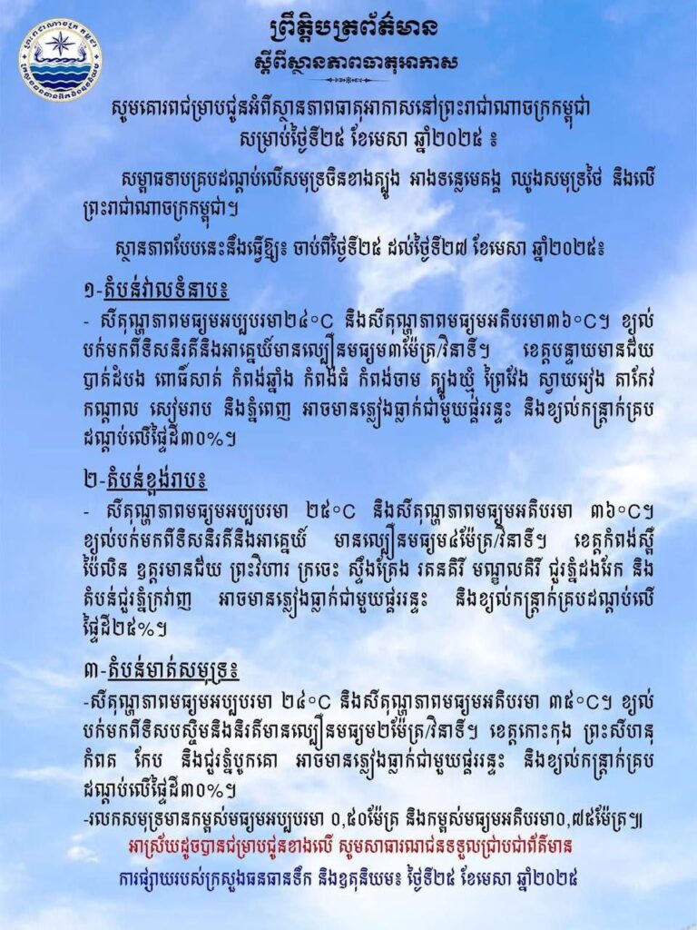 ក្រសួងធនធានទឹក និងឧតុនិយមបានឲ្យដឹងថា ចាប់ពីថ្ងៃទី២៥ ដល់ថ្ងៃទី២៧ ខែមេសា ឆ្នាំ២០២៥នេះ នៅភ្នំពេញ