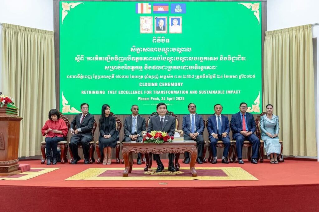 ការគូសបញ្ជាក់នេះ នៅក្នុងឱកាសដែលឯកឧត្តមរដ្ឋមន្ត្រី បានអញ្ជើញជាអធិបតីក្នុងពិធីបិទសិក្ខាសាលាស្តីពី «ការគិតឡើងវិញលើឧត្ដមភាពអប់រំបណ្តុះបណ្តាលបច្ចេកទេស និងវិជ្ជាជីវៈ (អ.ប.វ.) សម្រាប់បរិវត្តកម្ម និងផលជះប្រកបដោយនិរន្តរភាព» និង ពិធីប្រគល់ពានរង្វាន់គំរូឧត្តមភាពសកលសម្រាប់ការអប់រំនិងបណ្ដុះបណ្ដាលជំនាញ នៃប្រទេសសិង្ហបុរីជូនវិទ្យាស្ថានជាតិពហុបច្ចេកទេសកម្ពុជា (NPIC) និងវិទ្យាស្ថានជាតិបណ្តុះបណ្តាលបច្ចេកទេស (NTTI) នារសៀលថ្ងៃទី២៤ ខែមេសា ឆ្នាំ២០២៥ នៅវិទ្យាស្ថានជាតិបណ្តុះបណ្តាលបច្ចេកទេស (NTTI)។