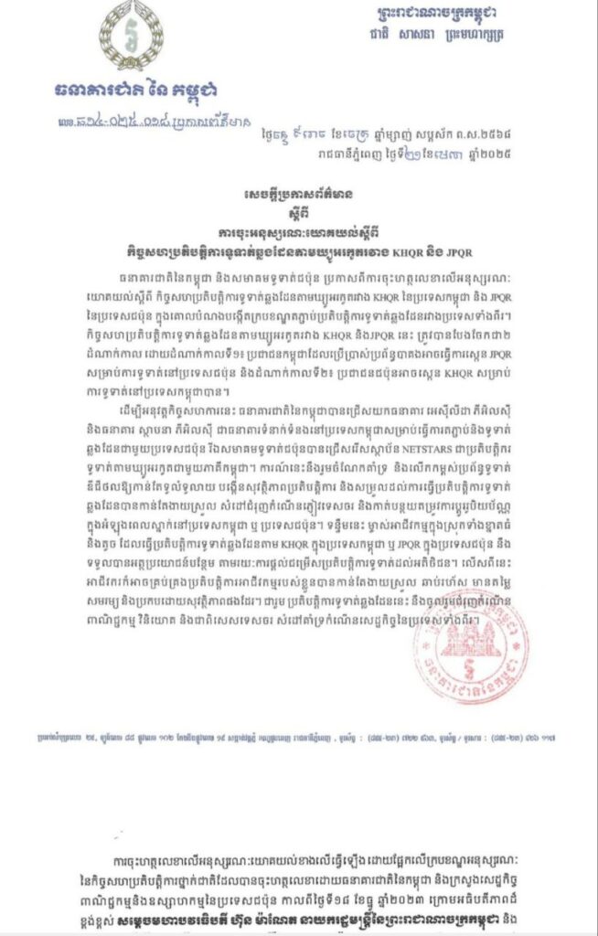 ធនាគារជាតិនៃកម្ពុជា និងសមាគមទូទាត់ជប៉ុន បានប្រកាសពីការចុះហត្ថលេខាលើអនុស្សរណៈ យោគយល់ស្តីពី កិច្ចសហប្រតិបត្តិការទូទាត់ឆ្លងដែនតាមឃ្យូអរកូតរវាង KHOR នៃប្រទេសកម្ពុជា និង JPOR នៃប្រទេសជប៉ុន ក្នុងគោលបំណងបង្កើតក្របខណ្ឌតភ្ជាប់ប្រតិបត្តិការទូទាត់ឆ្លងដែនរវាងប្រទេសទាំងពីរ។
