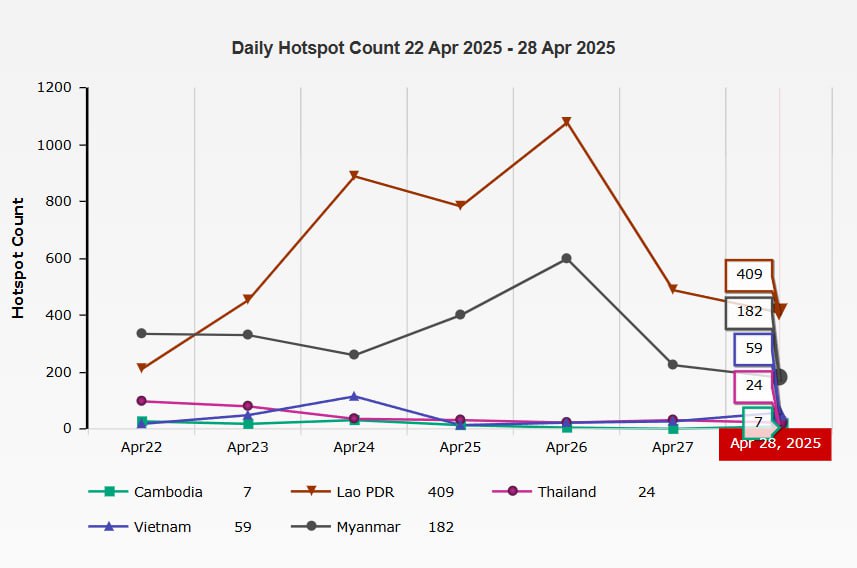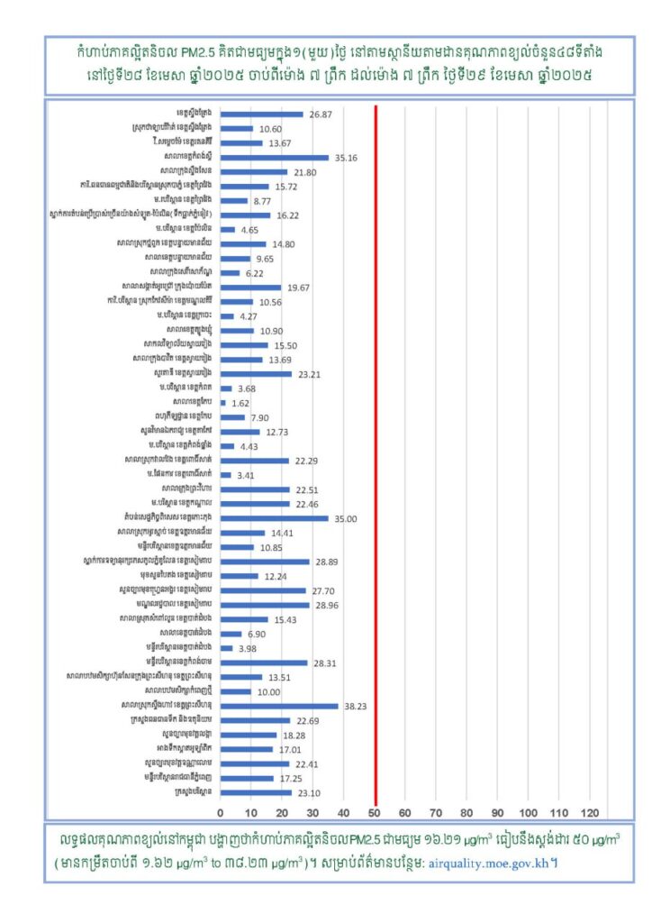 ក្រសួងបរិស្ថានសូមជូនដំណឹងអំពីស្ថានភាពគុណភាពខ្យល់នៅក្នុងព្រះរាជាណាចក្រកម្ពុជា សម្រាប់ថ្ងៃទី២៨ ខែមេសា ឆ្នាំ២០២៥ ចាប់ពីម៉ោង ៧ ព្រឹក ដល់ម៉ោង ៧ ព្រឹក ថ្ងៃទី២៩ ខែមេសា ឆ្នាំ២០២៥
