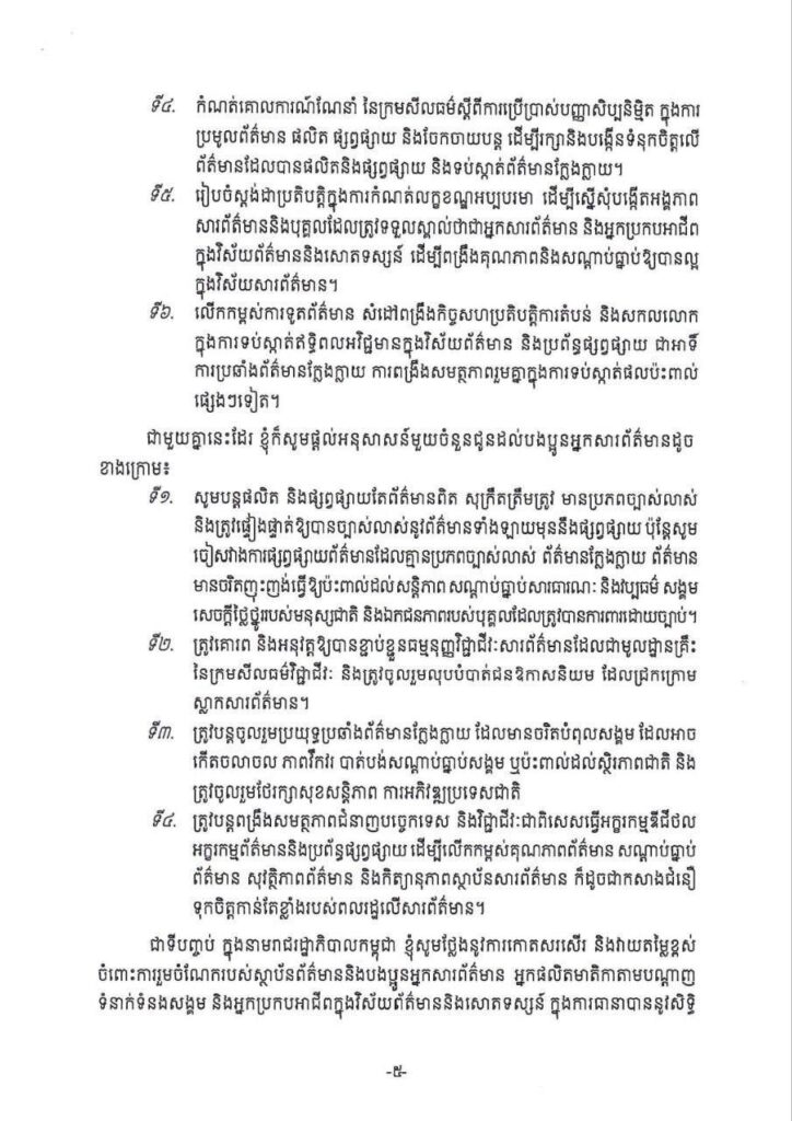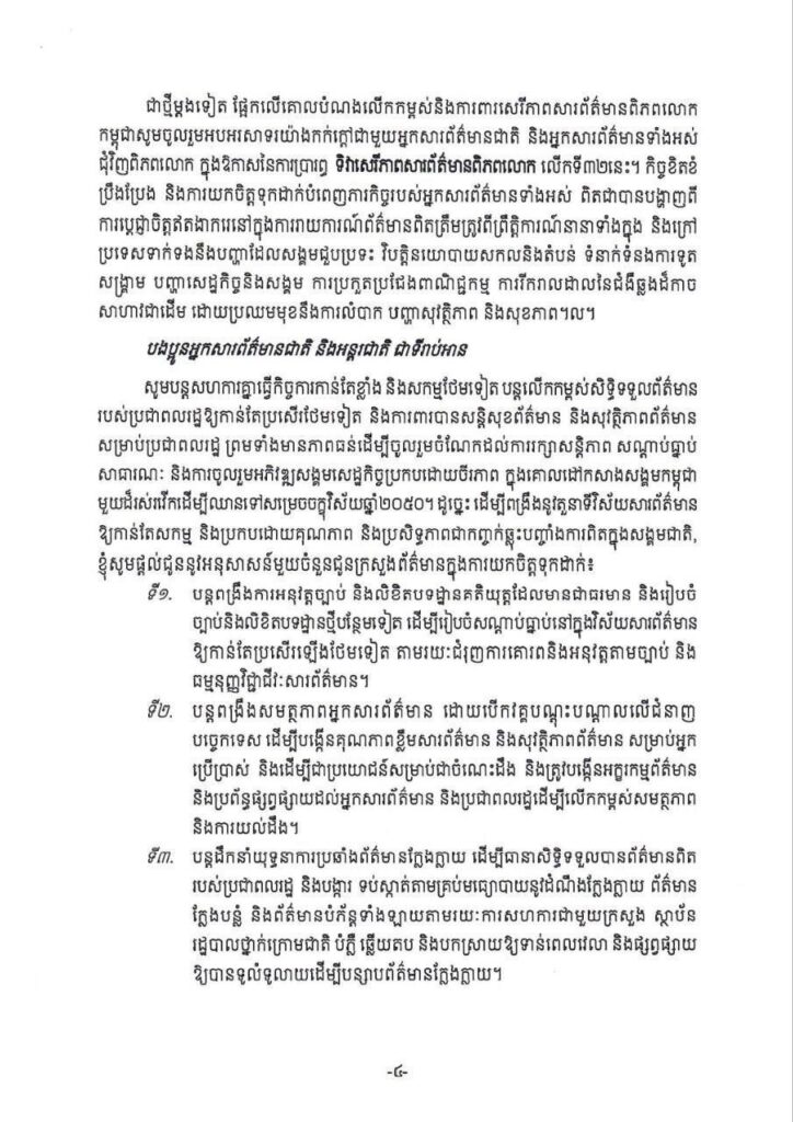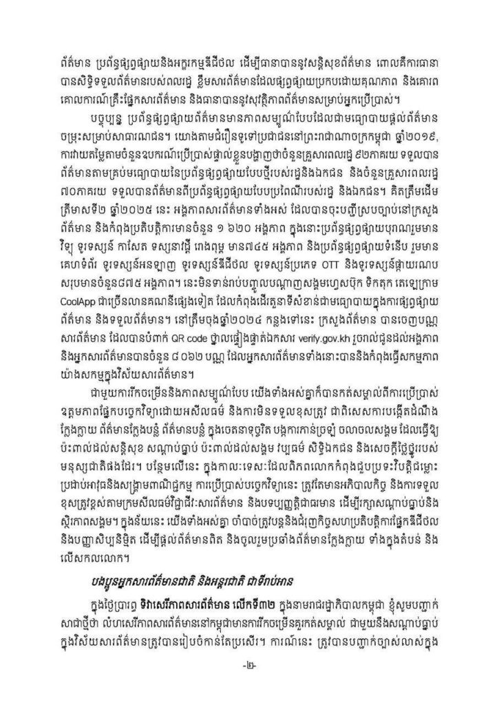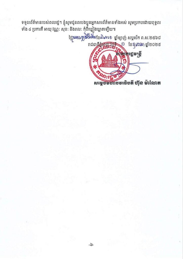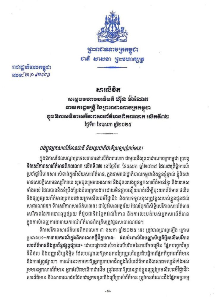 សារលិខិត សម្តេចមហាបវរធិបតី ហ៊ុន ម៉ាណែត នាយករដ្ឋមន្ត្រី នៃព្រះរា ជាណាចក្រកម្ពុជា ក្នុងឱកាសទិវាសេរីភាពសារព័ត៌មានពិភពលោក លើកទី៣២ ថ្ងៃទី៣ ខែឧសភា ឆ្នាំ២០២៥