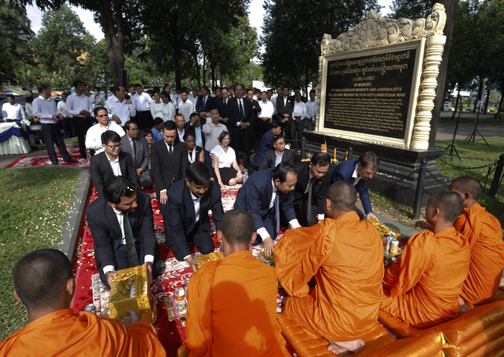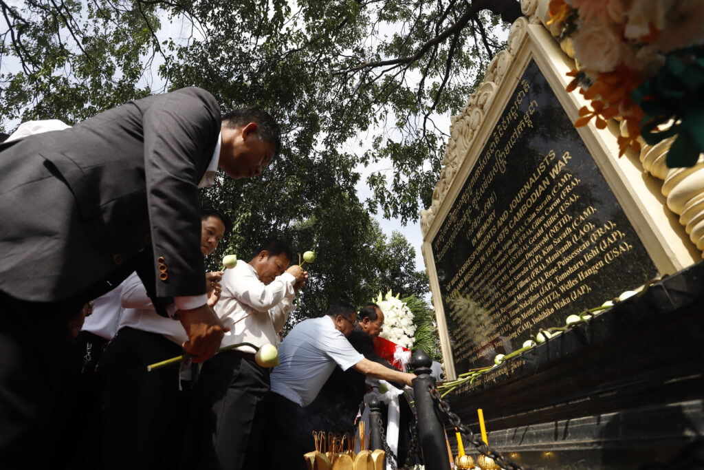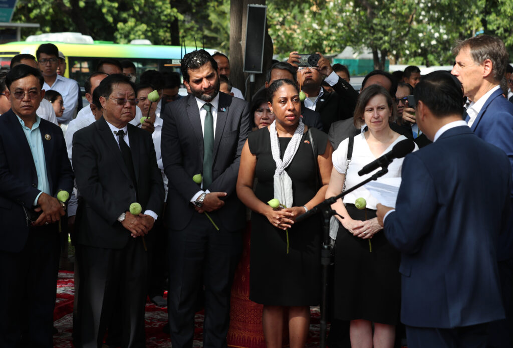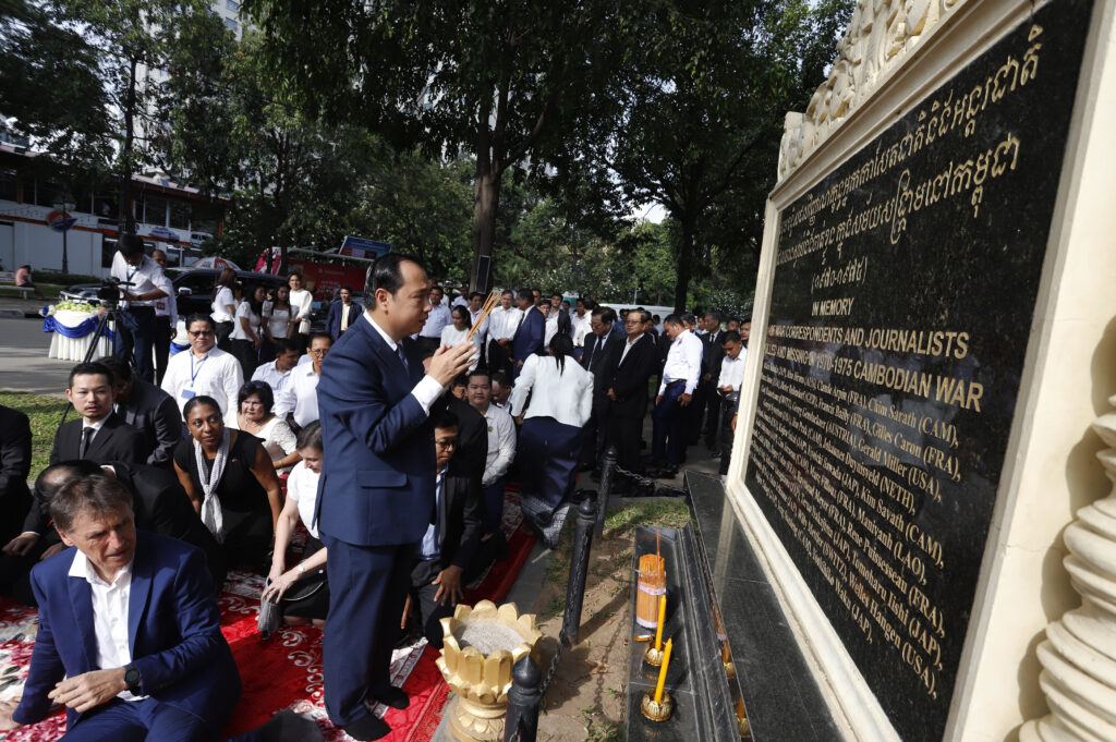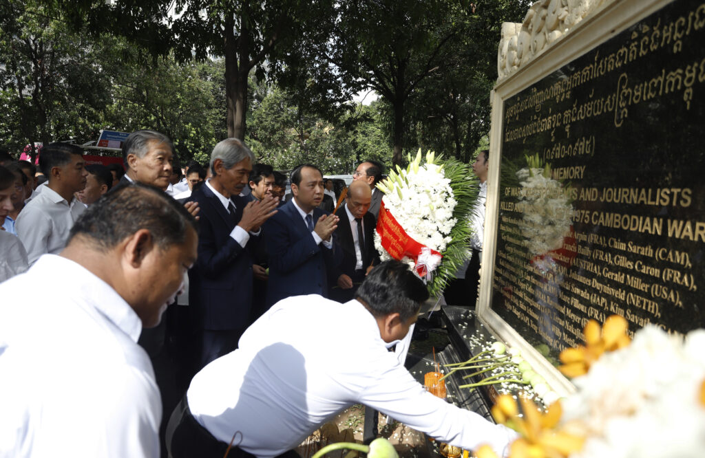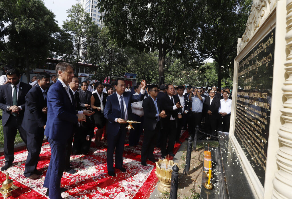 រដ្ឋមន្ត្រីក្រសួងព័ត៌មាន ជាមួយឯកអគ្គរដ្ឋទូត និង តំណាងស្ថានទូតបរទេស នៅកម្ពុជា គោរពវិញ្ញាណក្ខន្ធ នៅស្តូបអនុស្សាវរីយ៍ដើម្បីរំលឹកដល់អ្នកសារព័ត៌មានចំនួន ៣៧នាក់