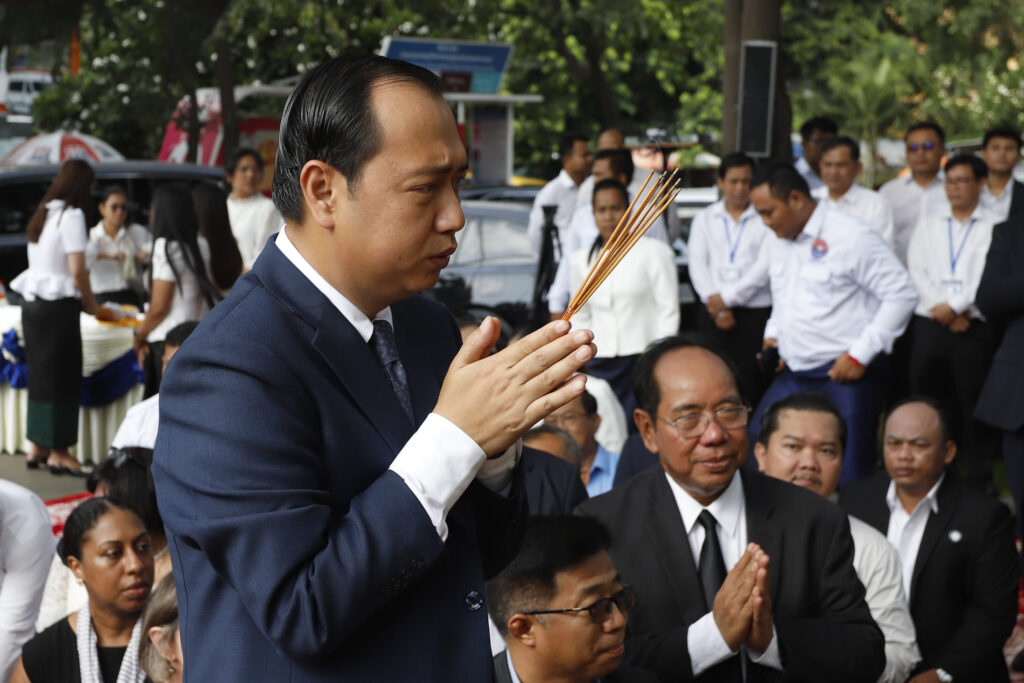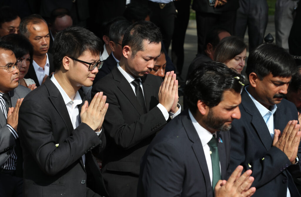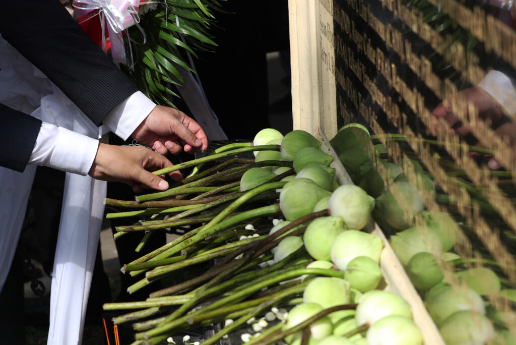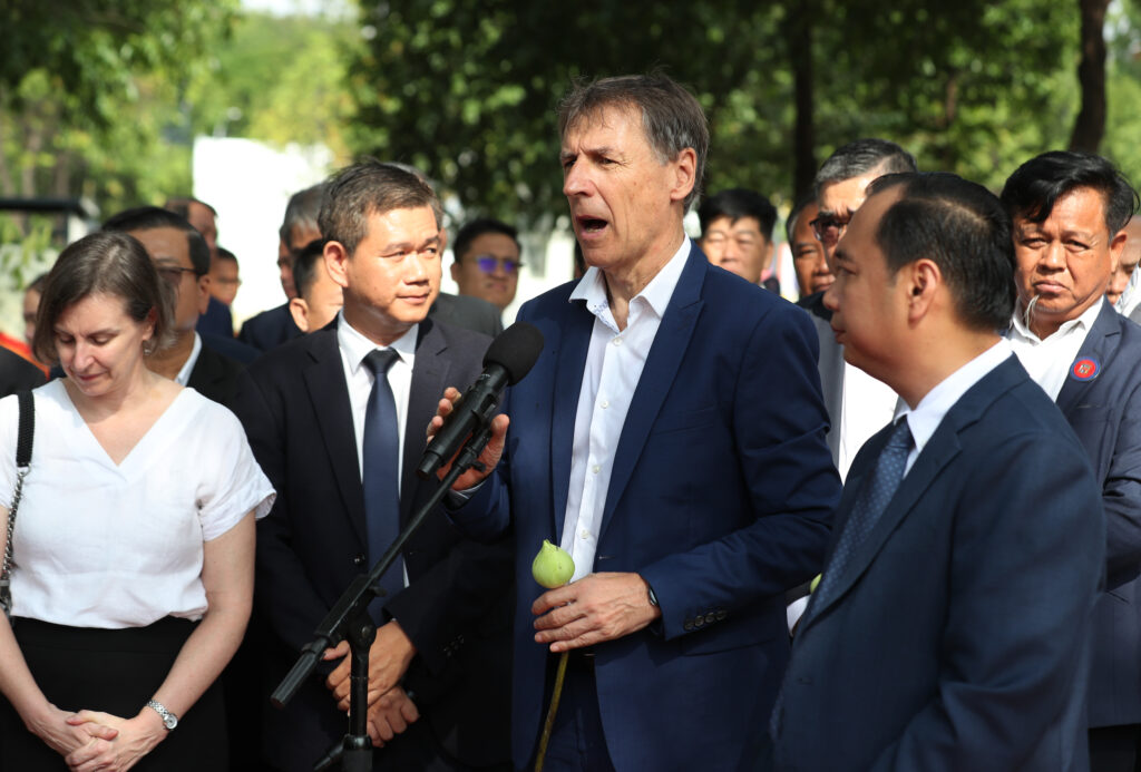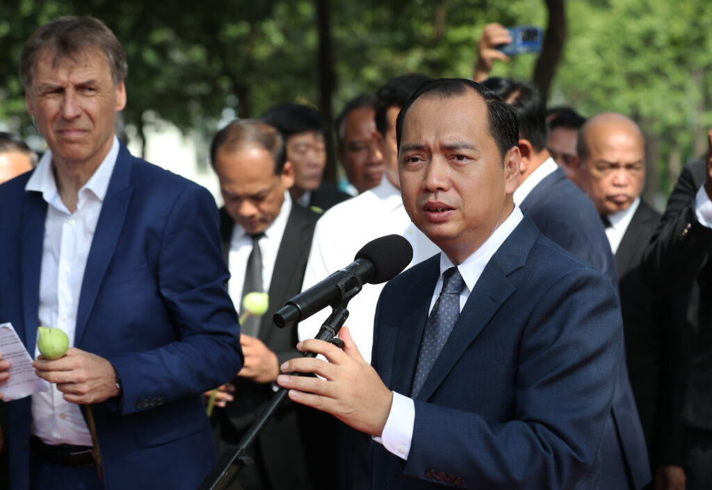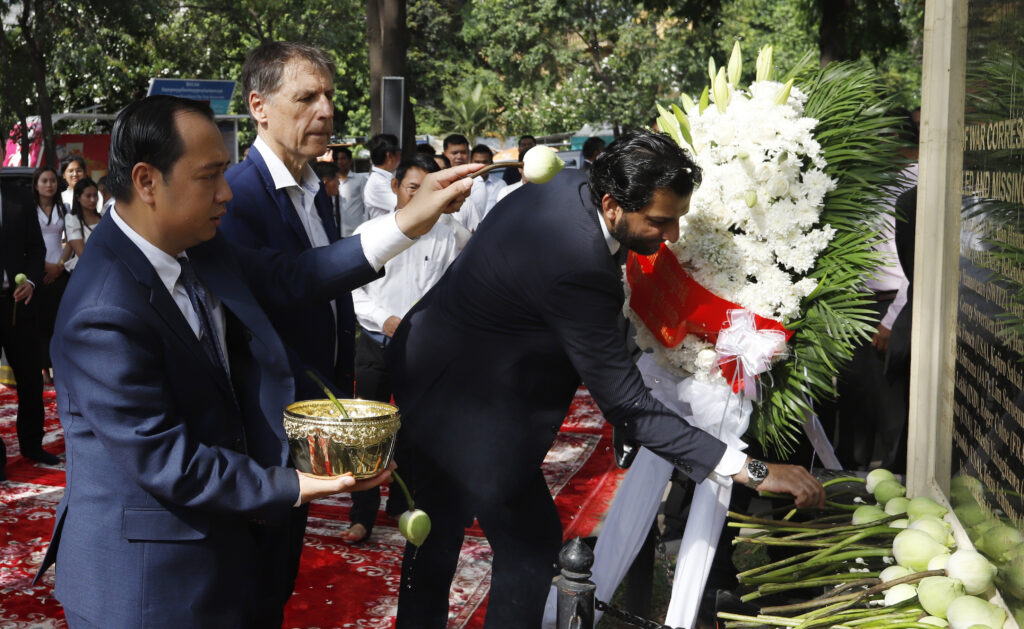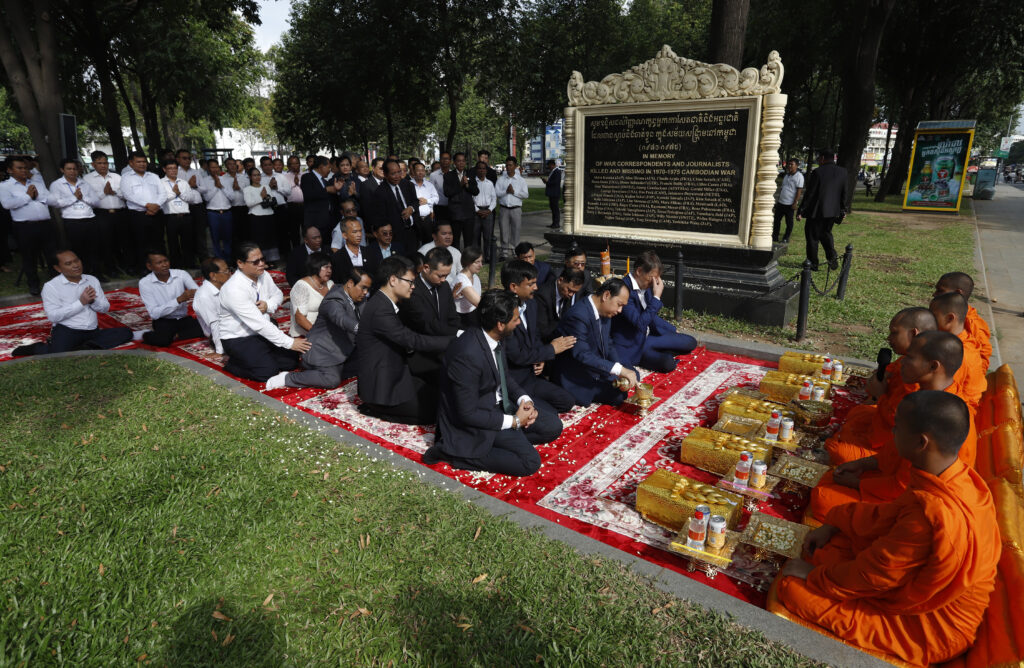 រដ្ឋមន្ត្រីក្រសួងព័ត៌មាន ជាមួយឯកអគ្គរដ្ឋទូត និង តំណាងស្ថានទូតបរទេស នៅកម្ពុជា គោរពវិញ្ញាណក្ខន្ធ នៅស្តូបអនុស្សាវរីយ៍ដើម្បីរំលឹកដល់អ្នកសារព័ត៌មានចំនួន ៣៧នាក់