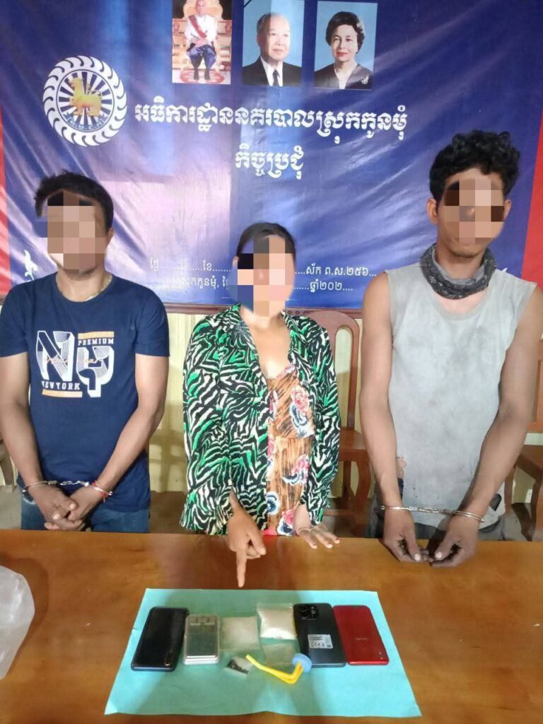 នគរបាលឃាត់ខ្លួនជនសង្ស័យចំនួន០៣ នាក់ ស្ថិតនៅចំណុចភូមិ២ ឃុំក្រពាំងក្រហម ស្រុកកូនមុំ ខេត្តរតនគិរី ពាក់ព័ន្ធករណីគ្រឿងញៀន ក្រោយពលរដ្ឋរាយការណ៍តាម App Nodrug