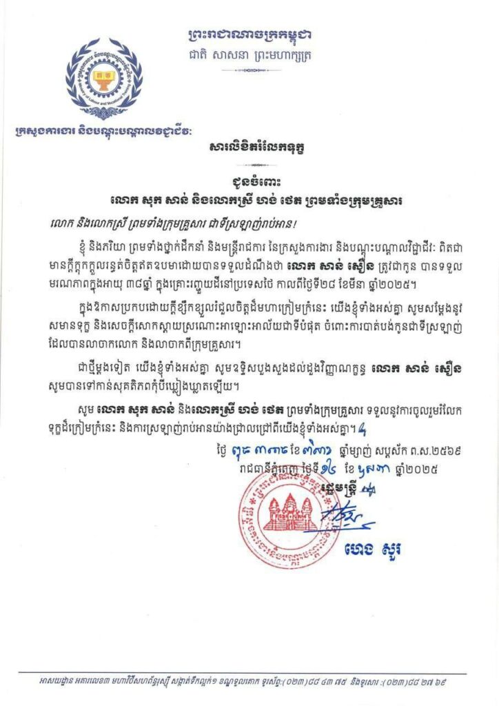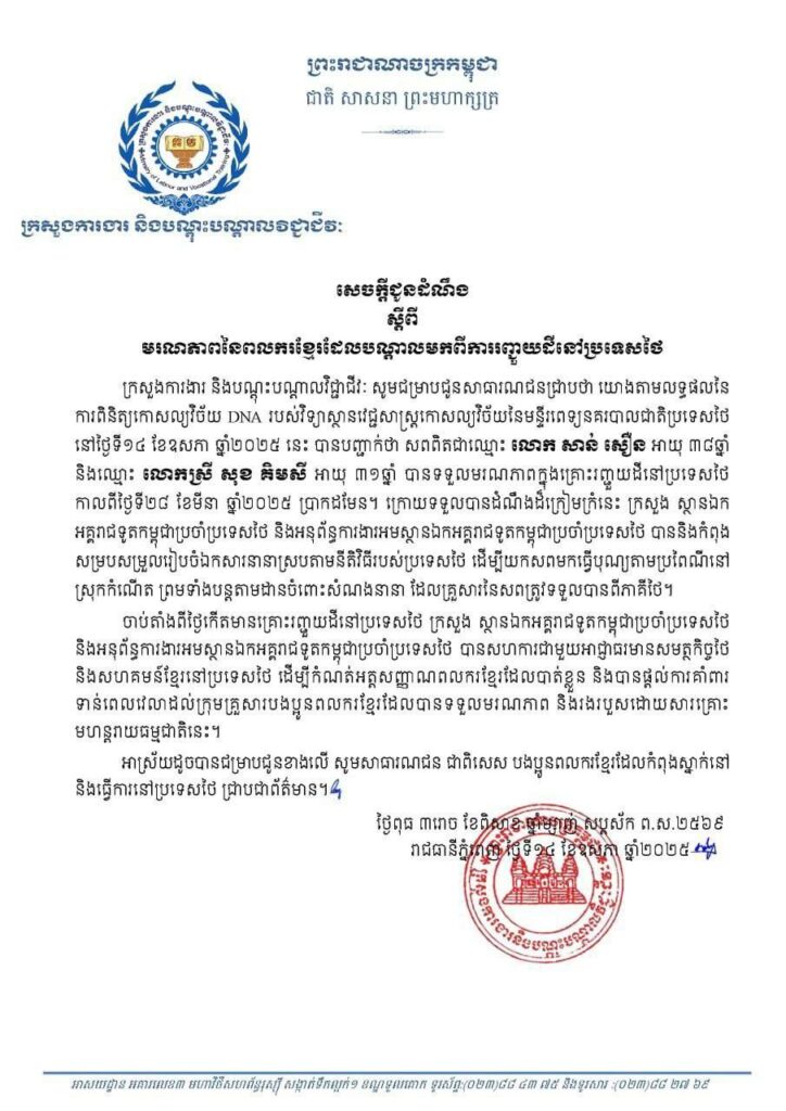 ឯកឧត្តម ស៊ុន មេសា អ្នកនាំពាក្យក្រសួងការងារ និងបណ្តុះបណ្តាលវិជ្ជាជីវៈ បានឱ្យដឹងថា ក្រោយទទួលបានដំណឹងដ៏ក្រៀមក្រំនេះ ក្រសួង ស្ថានឯកអគ្គរាជទូតកម្ពុជាប្រចាំប្រទេសថៃ និងអនុព័ន្ធការងារអមស្ថានឯកអគ្គរាជទូតកម្ពុជាប្រចាំប្រទេសថៃ បាននិងកំពុងសម្របសម្រួលរៀបចំឯកសារនានាស្របតាមនីតិវិធីរបស់ប្រទេសថៃ ដើម្បីយកសពមកធ្វើបុណ្យតាមប្រពៃណីនៅស្រុកកំណើត ព្រមទាំងបន្តតាមដានចំពោះសំណងនានា ដែលគ្រួសារនៃសពត្រូវទទួលបានពីភាគីថៃ។