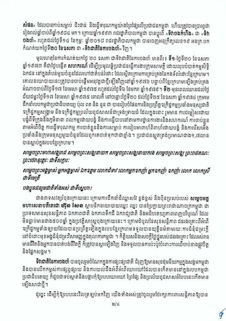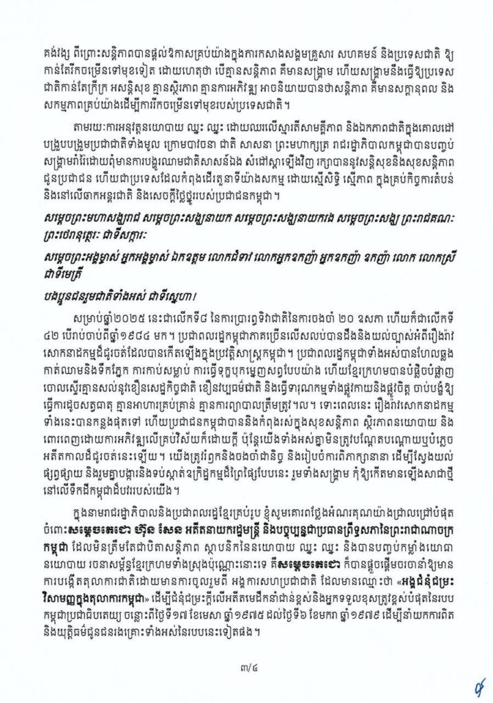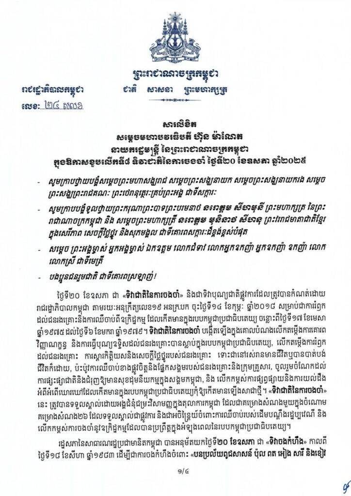 សារលិខិត សម្តេចមហាបវរធិបតី ហ៊ុន ម៉ាណែត នាយករដ្ឋមន្ត្រី នៃព្រះរាជាណាចក្រកម្ពុជា ក្នុងឱកាសខួបលើកទី៨ ទិវាជាតិ