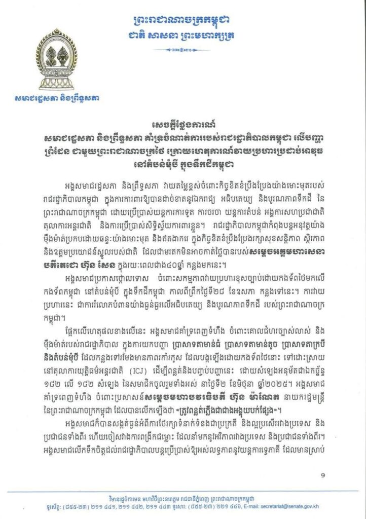 សមាជរដ្ឋសភា និងព្រឹទ្ធសភា ចេញសេចក្តីថ្លែងការណ៍ គាំទ្រចំណាត់ការរបស់រាជរដ្ឋាភិបាលកម្ពុជា លើបញ្ហា ព្រំដែន