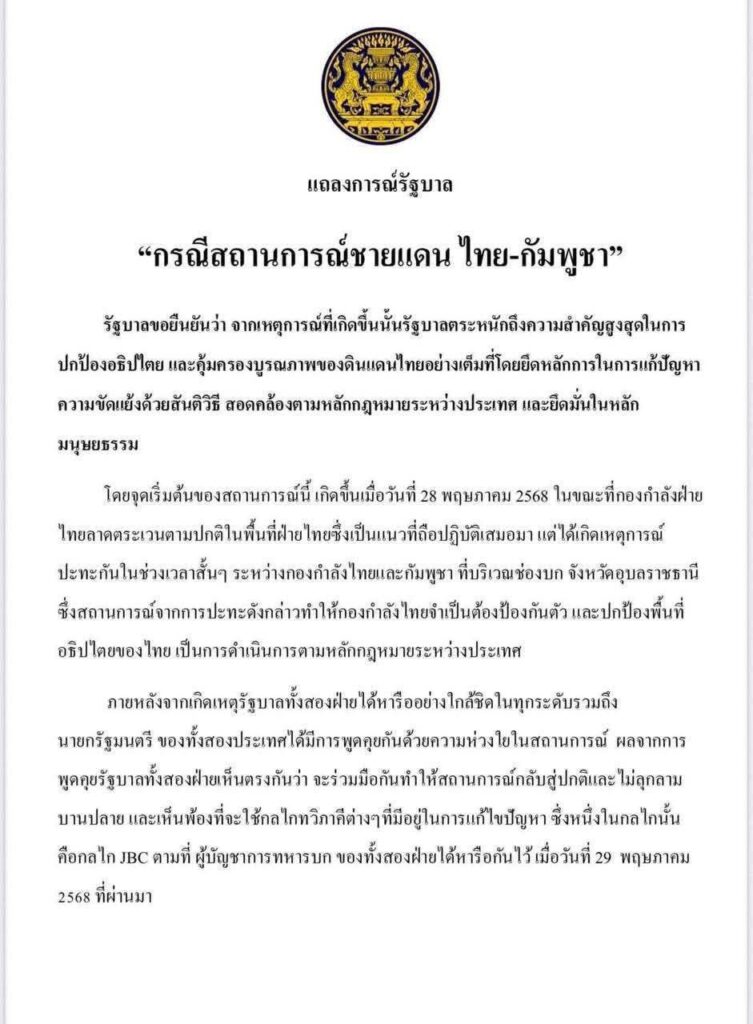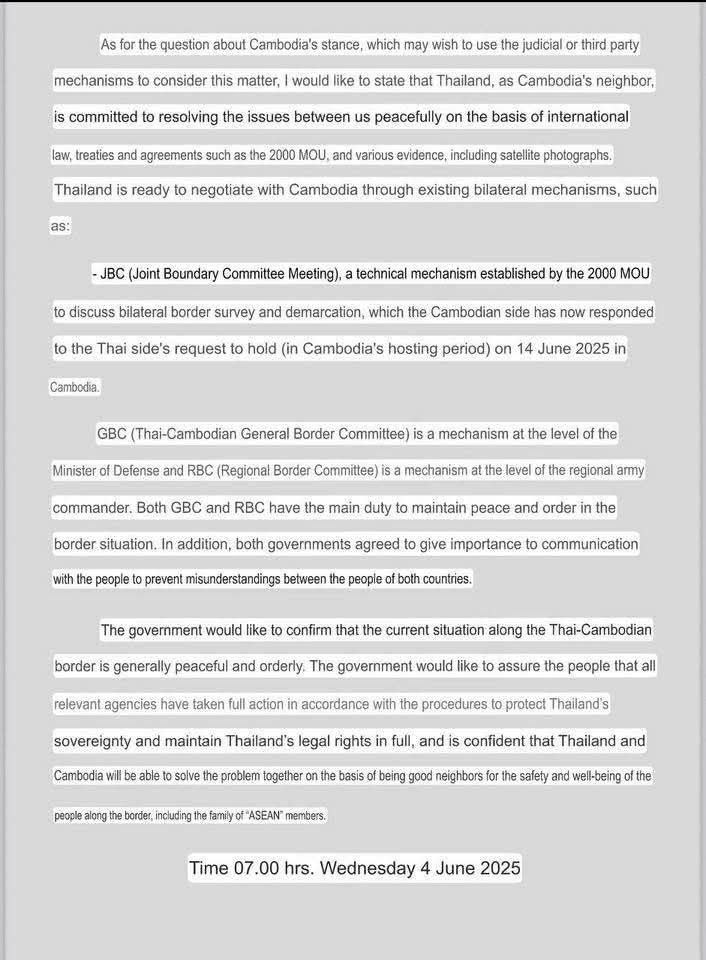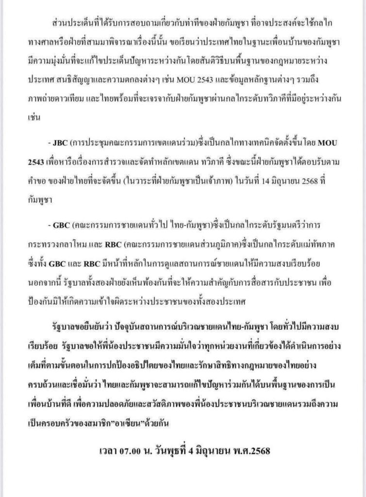 នៅក្នុងសេចក្តីថ្លែការ រាជរដ្ឋាភិបាលថៃចង់ត្រឹមចរចា រកដំណោះស្រាយព្រំដែនជាមួយកម្ពុជា ជាលក្ខណៈទ្វេភាគី ដោយប្រើយន្តការគណៈកម្មការព្រំដែនចម្រុះ (JBC) និងគណៈកម្មការព្រំដែនទូទៅ (GBC)។