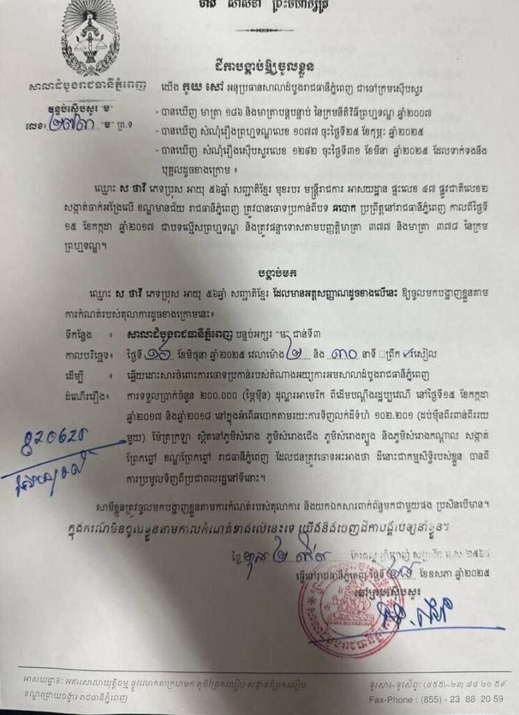 ដីកាដដែលនោះ បានកំហិតថា ក្នុងករណីនៅថ្ងៃទី១៦ ខែមិថុនា ឆ្នាំ២០២៥ បុគ្គលឈ្មោះ ស ថាវី មិនចូលខ្លួនទៅកាន់តុលាការទេនោះ ចៅក្រមស៉ើបសួរ នឹងចេញដីកាបង្គាប់ឲ្យនាំខ្លួនតែម្ដង។