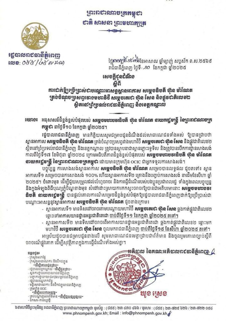 ស្ពានអាកាសសម្តេចធិបតី ហ៊ុន ម៉ាណែត ទី១ នឹងបើកឲ្យធ្វើដំណើរនៅថ្ងៃស្អែក និងទី២ នឹងបើកនៅថ្ងៃទី១៥ ខែសីហា