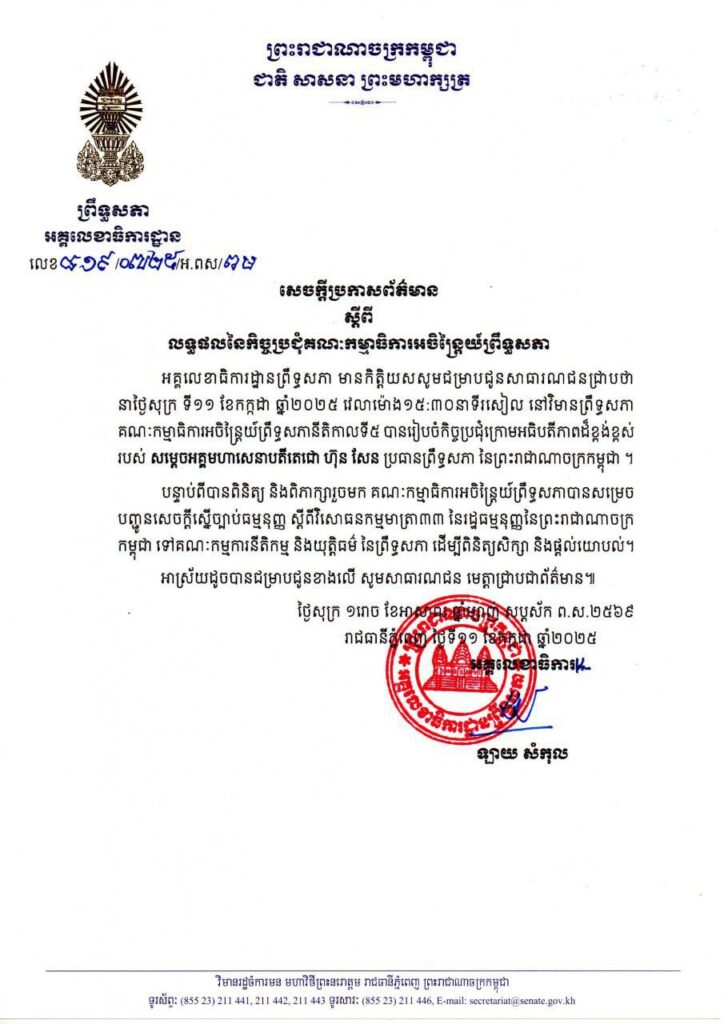 សេចក្តីប្រកាសព័ត៌មានស្តីពី លទ្ធផលនៃកិច្ចប្រជុំគណៈកម្មាធិការអចិន្រ្តៃយ៍ព្រឹទ្ធសភា នីតិកាលទី៥