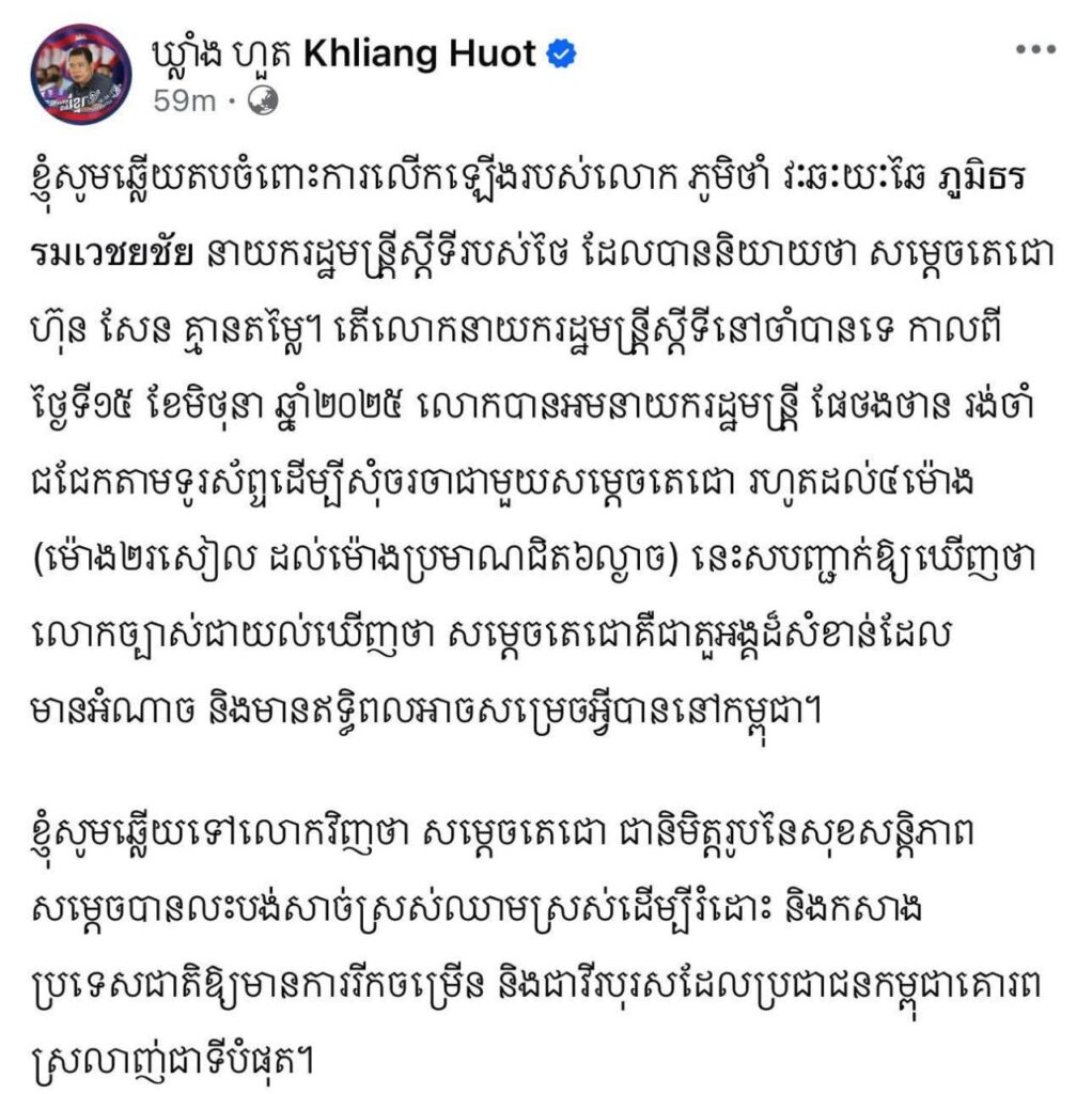 លោក ឃ្លាំង ហួត ជូនសារទៅនាយករដ្ឋមន្រ្តីស្តីទីរបស់ថៃ ដែលនិយាយទាំងងងើល មកលើសម្តេចតេជោ ហ៊ុន សែន៕