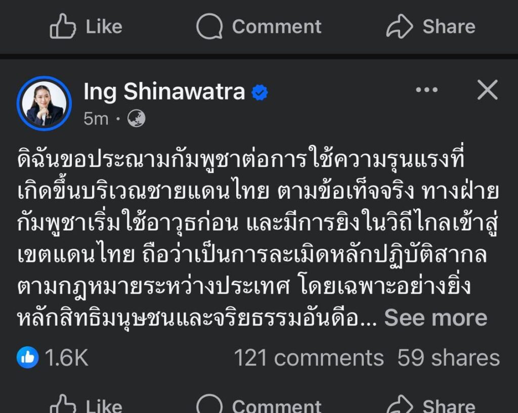 អតីតនាយករដ្ឋមន្ត្រីថៃ ផែថងថាន បានបង្ហោះសំណេរទួញសោក របៀបផ្លែល្វាថា ខ្ញុំសូមថ្កោលទោសកម្ពុជាចំពោះអំពើហិង្សាដែលបានកើតឡើងនៅព្រំដែនថៃ