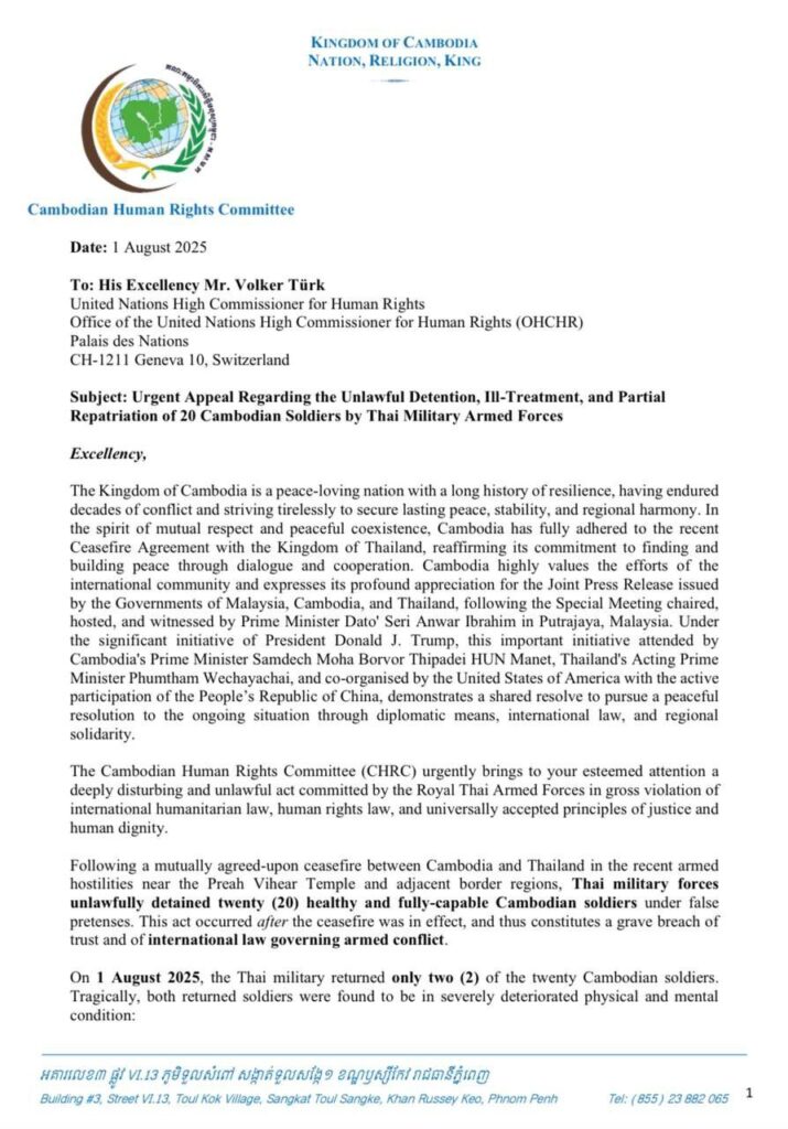 កម្ពុជាដាក់ញ្ញត្តិបន្ទាន់ទៅឧត្តមស្នងការនៃការិយាល័យឧត្ដមស្នងការអង្គការសហប្រជាជាតិទទួលបន្ទុកសិទ្ធិមនុស្ស នៅទីក្រុងហ្សឺណែវ