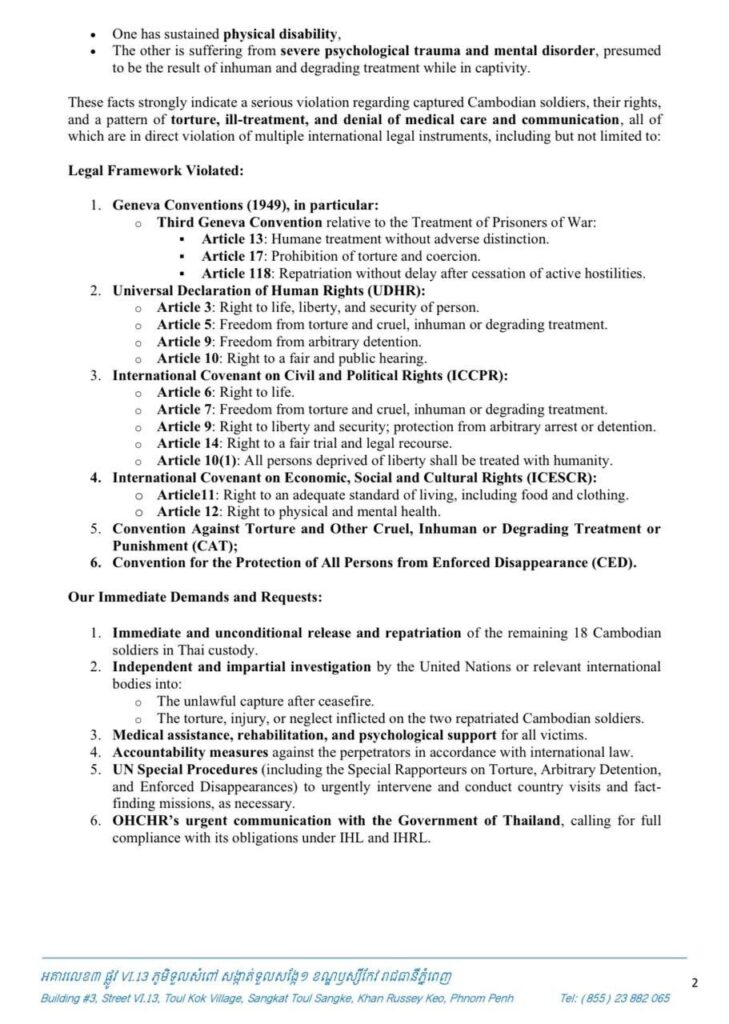 ការសហប្រជាជាតិទទួលបន្ទុកសិទ្ធិមនុស្ស នៅទីក្រុងហ្សឺណវ ពាក់ព័ន្ធនឹងករណីយោធាថៃ ចាប់ខ្លួន និងឃុំខ្លួនយោធាកម្ពុជា ក្រោយកិច្ចព្រមព្រៀងបទឈប់បាញ់៕
