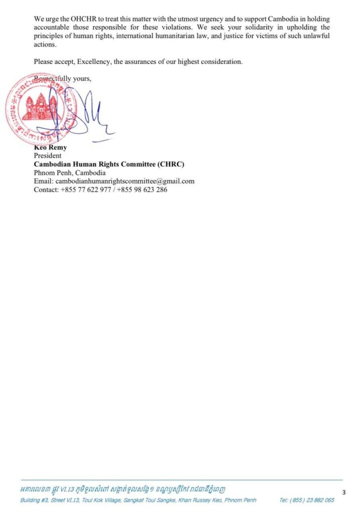 ប្រធានគណៈកម្មាធិការសិទ្ធិមនុស្សកម្ពុជាដាក់ញ្ញត្តិបន្ទាន់ទៅឧត្តមស្នងការនៃការិយាល័យឧត្ដមស្នងការអង្គ