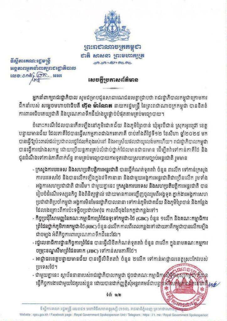 សេចក្តីប្រកាសព័ត៌មាន របស់អ្នកនាំពាក្យរាជរដ្ឋាភិបាល សូមបញ្ជាក់ជូនសាធារណជនជ្រាបថា ការការពារអធិបតេយ្យជាតិ និងបូរណភាពទឹកដី