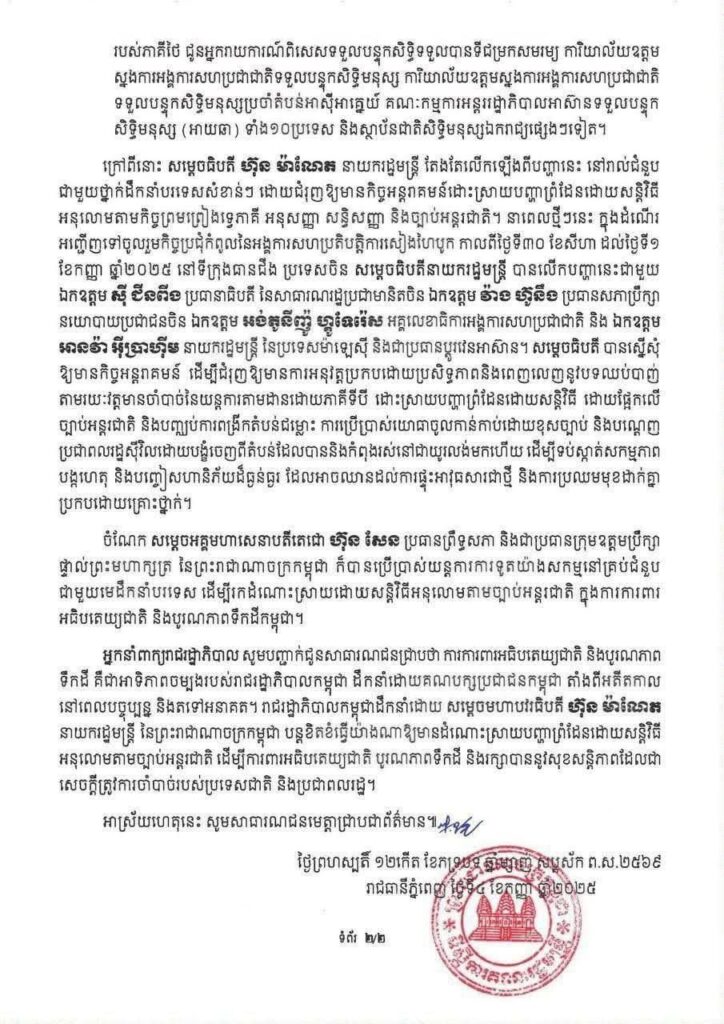 សេចក្តីប្រកាសព័ត៌មាន របស់អ្នកនាំពាក្យរាជរដ្ឋាភិបាល សូមបញ្ជាក់ជូនសាធារណជនជ្រាបថា ការការពារអធិបតេយ្យជាតិ និងបូរណភាពទឹកដី