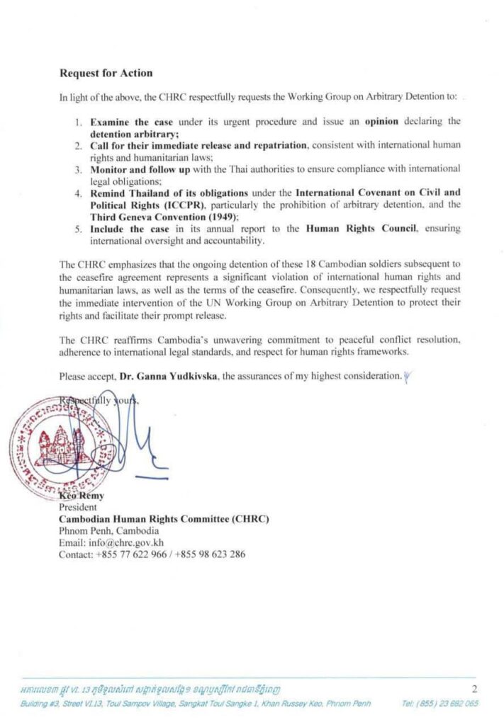 ៤.រម្លឹកភាគីថៃឱ្យគោរពតាមកាតព្វកិច្ចក្រោមកតិកាសញ្ញាអន្តរជាតិស្ដីពីសិទ្ធិពលរដ្ឋ និងសិទ្ធិនយោបាយ និងអនុសញ្ញាទីក្រុងហ្សឺណែវឆ្នាំ១៩៤៩ និង