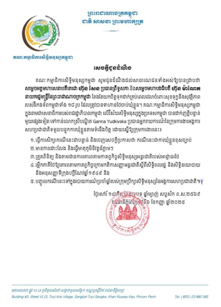 គណៈកម្មាធិការសិទ្ធិមនុស្សកម្ពុជាបានដាក់ញត្តិបន្ទាន់មួយផ្សេងទៀត ទៅកាន់លោកស្រីបណ្ឌិត Ganna Yudkivska