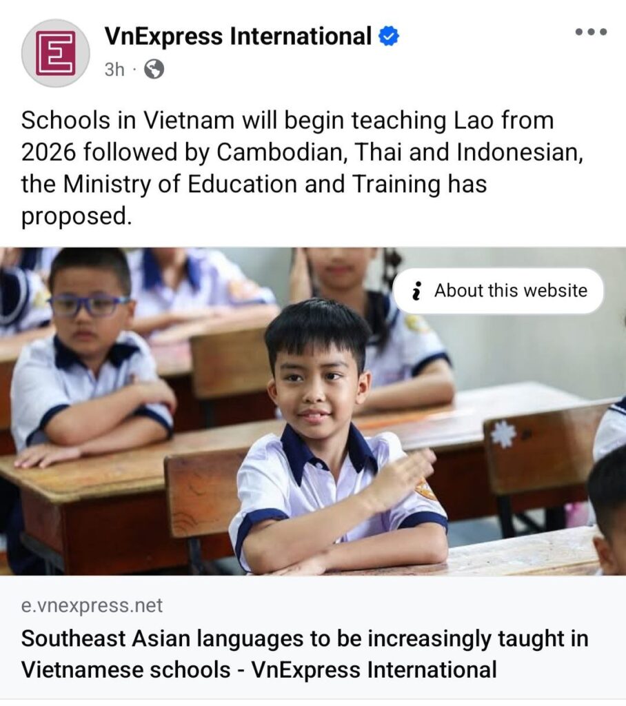 នេះបើយោងតាមការចេញផ្សាយដោយកាសែតវៀតណាម VNExpress។ជាការឆ្លើយតបជាមួយនឹងការពង្រឹងភាសាអន្តរជាតិក្នុងចន្លោះឆ្នាំ ២០២៦-២០៣៥ ដែលបានប្រកាសកាលពីចុងសប្តាហ៍មុនដោយក្រសួងអប់រំវៀតណាមគ្រោងនឹងដាក់បញ្ចូលភាសាខ្មែរនៅឆ្នាំ ២០២៨ និងភាសាថៃ ដើម្បីពង្រឹងការអប់រំផ្នែកភាសាក៏ដូចជាកិច្ចព្រមព្រៀងជាមួយនឹងប្រទេសជិតខាងខ្លួន៕