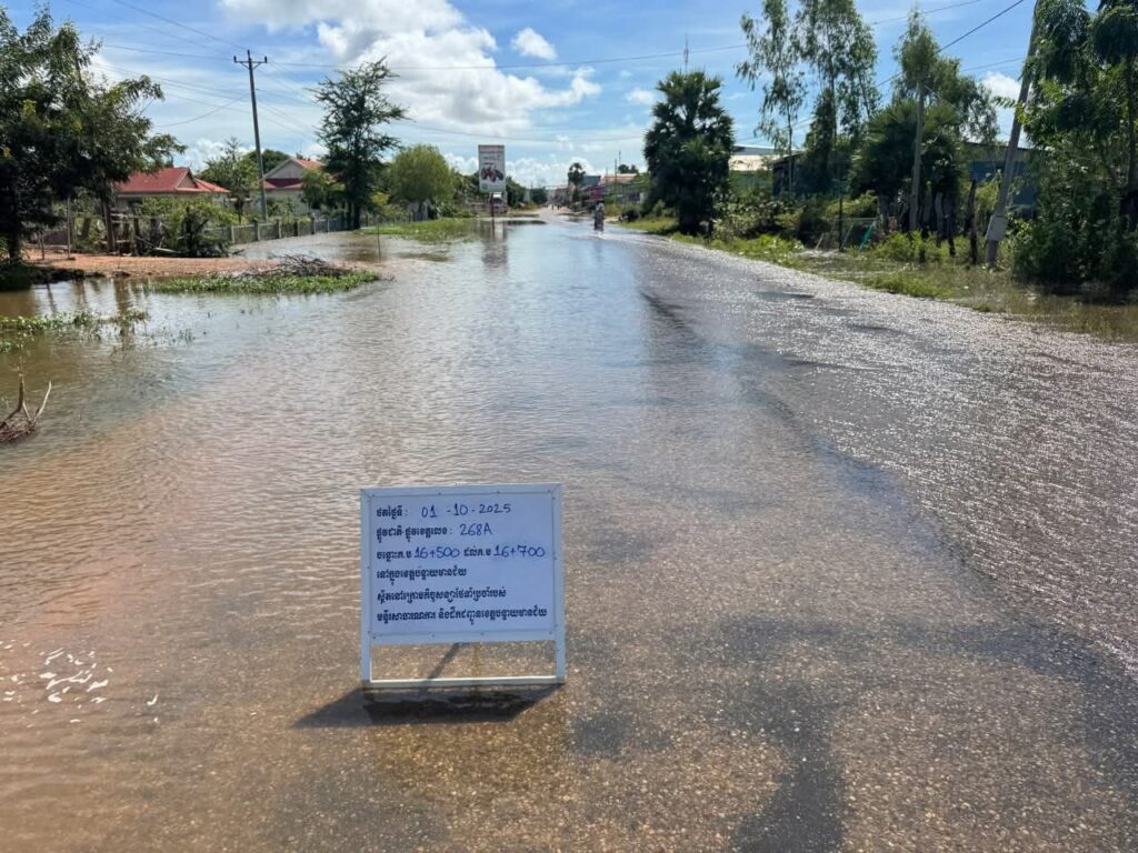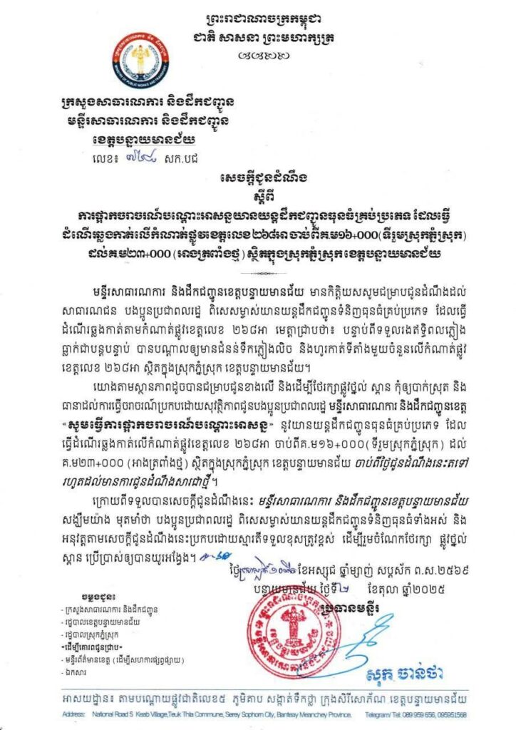 ភ្នំស្រុក ខេត្តបន្ទាយមានជ័យ ត្រូវផ្អាក ចរាចរណ៍បណ្តោះអាសន្នយានយន្តដឹកជញ្ជូនធុនធំគ្រប់ប្រភេទ ដោយសារទឹកជំនន់ហូរកាត់។