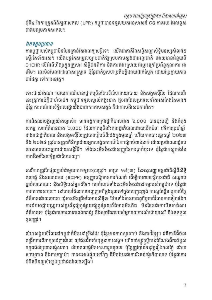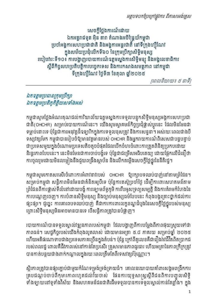 លោកឯកអគ្គរាជទូត អ៊ុន តារា លើកឡើងបែបនេះនៅក្នុងសម័យប្រជុំលើកទី៦០ នៃក្រុមប្រឹក្សាសិទ្ធិមនុស្ស របៀបវារៈទី១០៖ ការបង្ហាញរបាយការណ៍ឧត្តមស្នងការសិទ្ធិមន្យុ និងអង្គលេខាធិការ ស្តីពីកិច្ចសហប្រតិបត្តិការបច្ចេកទេស និងការកសាងសមត្ថភាព នៅកម្ពុជា នៅថ្ងៃទី០៣ ខែតុលា ឆ្នាំ២០២៥៕