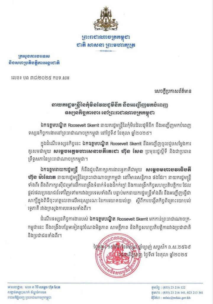 ក្រសួងការបរទេសកម្ពុជាបានឲ្យដឹងថា លោក Roosevelt Skerrit នាយករដ្ឋមន្ត្រីនៃកុំមិនវែលដូមីនីក នឹង
