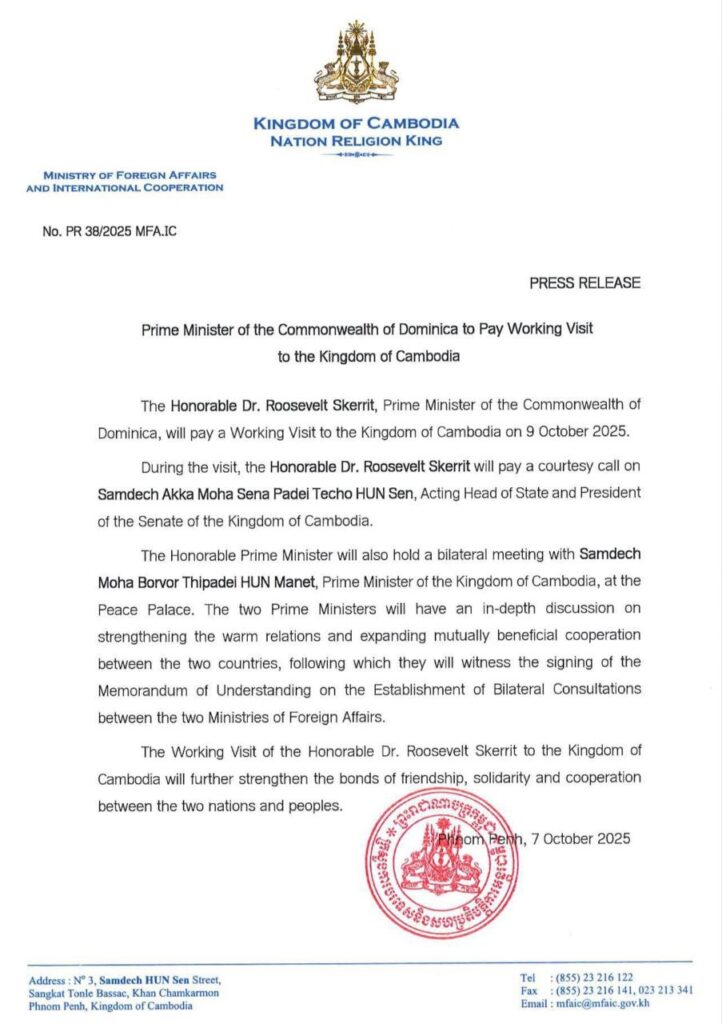 ដំណើរទស្សនកិច្ចការងាររបស់បណ្ឌិត Roosevelt Skerrit មកកាន់កម្ពុជានេះ នឹងពង្រឹងបន្ថែមទៀតនូវចំណងមិត្តភាព សាមគ្គីភាព និងកិច្ចសហប្រតិបត្តិការរវាងប្រជាជាតិ និងប្រជាជនទាំងពីរ៕