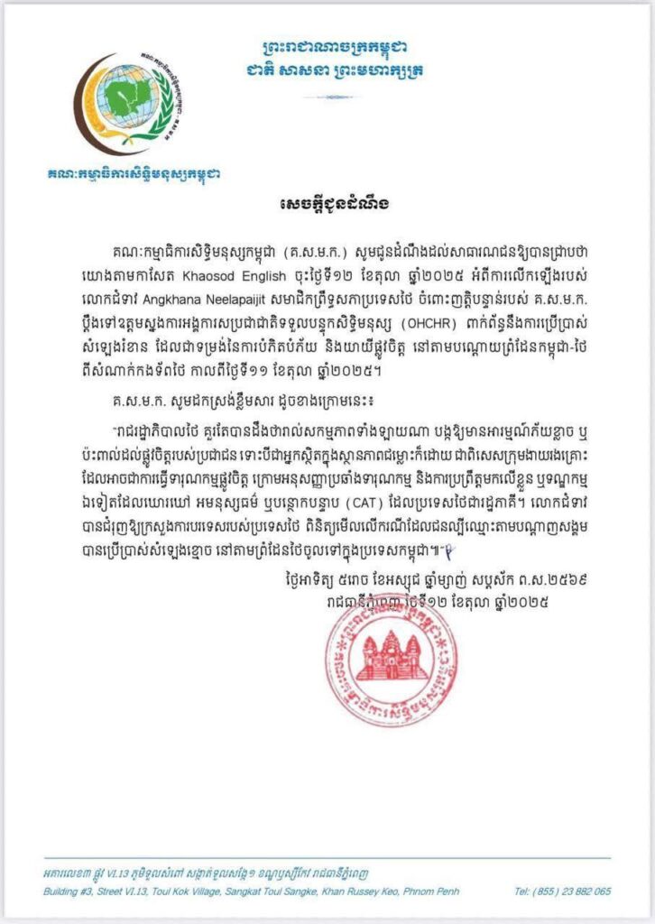 គណៈកម្មាធិការសិទ្ធិមនុស្សកម្ពុជាជូនដំណឹងពីការចាក់សំលេងរំខានរបស់ថៃ ជូនសមាជិកព្រឹទ្ធសភាប្រទេសថៃ