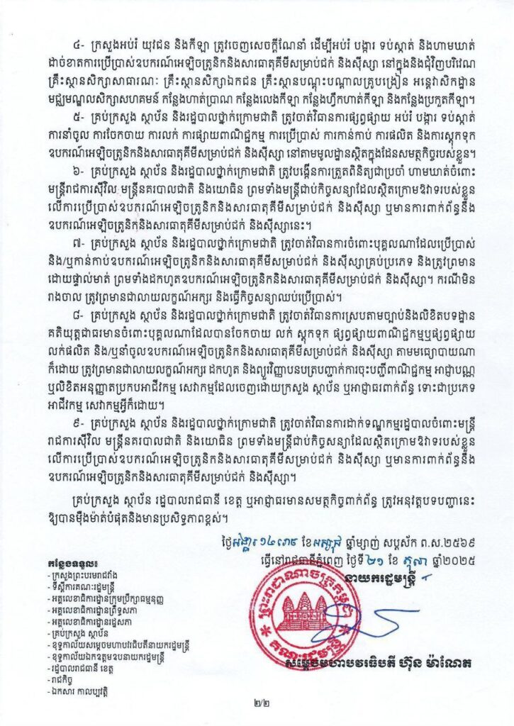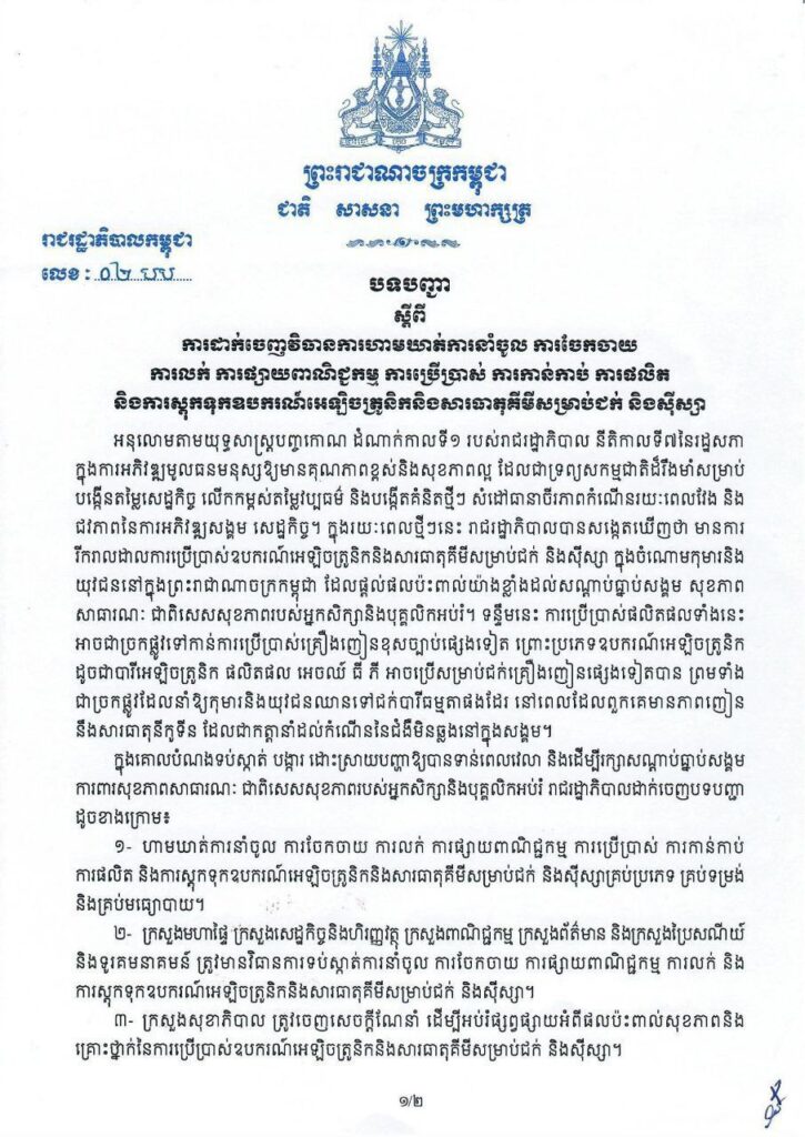 រាជរដ្ឋាភិបាល ចេញបទបញ្ជា ហាមឃាត់ ការនាំចូល ការចែកចាយ ឧបករណ៍អេឡិចត្រូនិក និងសារធាតុ គីមីសម្រាប់ជក់ និងស៊ីស្សា គ្រប់ប្រភេទ
