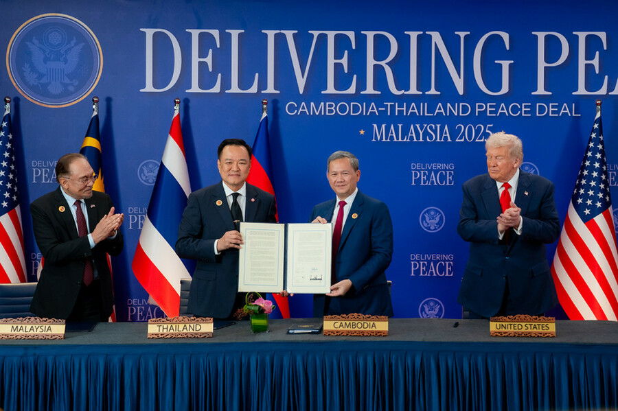 សម្តេចមហាបវរធិបតី ហ៊ុន ម៉ាណែត នាយករដ្ឋមន្ត្រី នៃព្រះរាជាណាចក្រកម្ពុជា និងនាយករដ្ឋមន្ត្រី នៃព្រះរាជាណាចក្រថៃ និងដោយមានប្រធានាធិបតីសហរដ្ឋអាមេរិក និង នាយករដ្ឋមន្ត្រីម៉ាឡេស៊ី ធ្វើជាសាក្សី បន្ទាប់ពីបានប្រជុំគ្នានៅទីក្រុងគួឡាឡាំពួរ ប្រទេសម៉ាឡេស៊ី នៅថ្ងៃទី២៦ ខែតុលា ឆ្នាំ២០២៥នេះ បានឯកភាពគ្នា៨ចំណុច ដើម្បីស្តារ និងរក្សាទំនុកចិត្ត ការជឿទុកចិត្តគ្នាទៅវិញទៅមក និងសន្តិភាពតាមបណ្ដោយព្រំដែន។