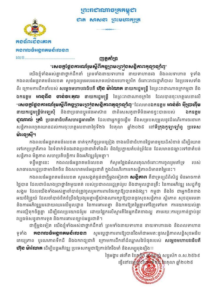 កងពលធំអន្តរាគមន៍លេខ៣ កងទ័ពជើងគោកនៃកងយោធពលខេមរភូមិន្ទ ក៏បានគូសបញ្ជាក់ថា កម្ពុជា និងថៃ ជាអ្នកជិតខាងអចិន្ត្រៃយ៍ ដែលចាំបាច់ខិតខំប្រឹងប្រែងរួមគ្នាធ្វើយ៉ាងណារក្សាឱ្យបាននូវសុខសន្តិភាព ស្ថិរភាព សុខដុមរមនា និងការអភិវឌ្ឍរួមដោយឈរលើមូលដ្ឋាននៃការគោរពគ្នា និងការឱ្យតម្លៃគ្នាទៅវិញទៅមក ការយោគយល់គ្នា ការជឿទុកចិត្តគ្នា ដើម្បីផលប្រយោជន៍រួម ដោយផ្អែកលើស្មារតីនៃអ្នកជិតខាងល្អ តាមរយៈការប្រកាន់ខ្ជាប់នូវវប្បធម៌សន្ទនាការទូត និងការគោរពច្បាប់អន្តរជាតិ។ បើទោះជាបានអះអាងបែបនេះ កងពលធំអន្តរាគមន៍លេខ៣ ក៏បានប្រកាសជំហររបស់ខ្លួនថា ថ្នាក់ដឹកនាំ ព្រមទាំងនាយទាហាន នាយទាហានរង និងពលទាហាន ទូទាំងកងពលធំអន្តរាគមន៍លេខ៣ ប្តេជ្ញាការពារឱ្យបានរឹងមាំជាអមតៈនូវសន្តិភាព សន្តិសុខ អធិបតេយ្យភាព បូរណភាពទឹកដី និងឯករាជ្យជាតិ ក្រោមការដឹកនាំរបស់សម្តេចធិបតី ហ៊ុន ម៉ាណែត ដើម្បីបន្តអភិវឌ្ឍប្រទេសកម្ពុជាឱ្យកាន់តែរឹងមាំ និងសម្បូររុងរឿង។