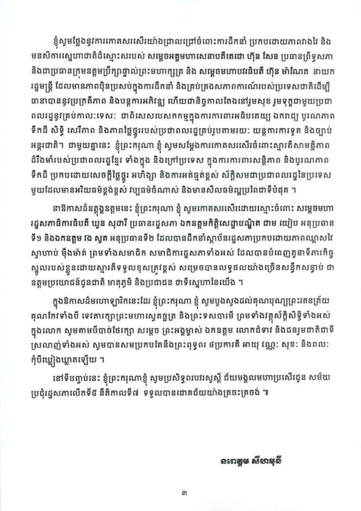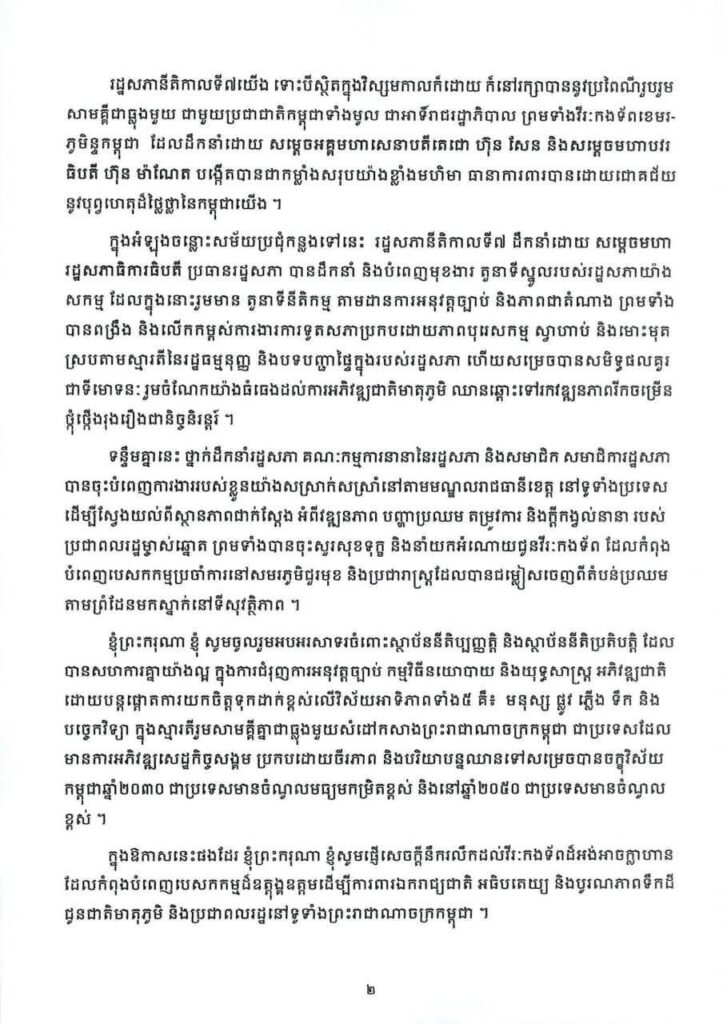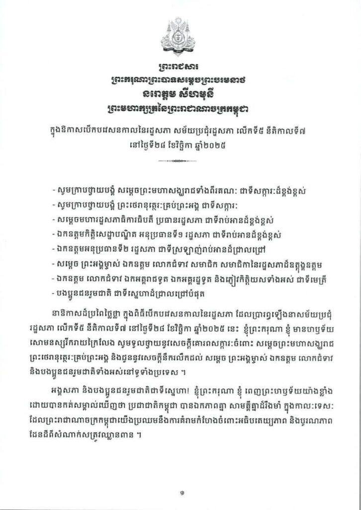 នីតិកាលទី៧ នៅថ្ងៃទី២៨ ខែវិច្ឆិកា ឆ្នាំ២០២៥ នេះ ព្រះករុណាព្រះមហាក្សត្រ ពេញព្រះហឫទ័យយ៉ាងខ្លាំង ដោយបានកត់សម្គាល់ឃើញថា ប្រជាជាតិកម្ពុជា បានឯកភាពគ្នា សាមគ្គីគ្នាដ៏រឹងមាំ ក្នុងកាលៈទេសៈ ដែលព្រះរាជាណាចក្រកម្ពុជាយើងប្រឈមនឹងការគំរាមកំហែងចំពោះអធិបតេយ្យភាព និងបូរណភាព ដែនដីពីសំណាក់សត្រូវឈ្លានពាន៕