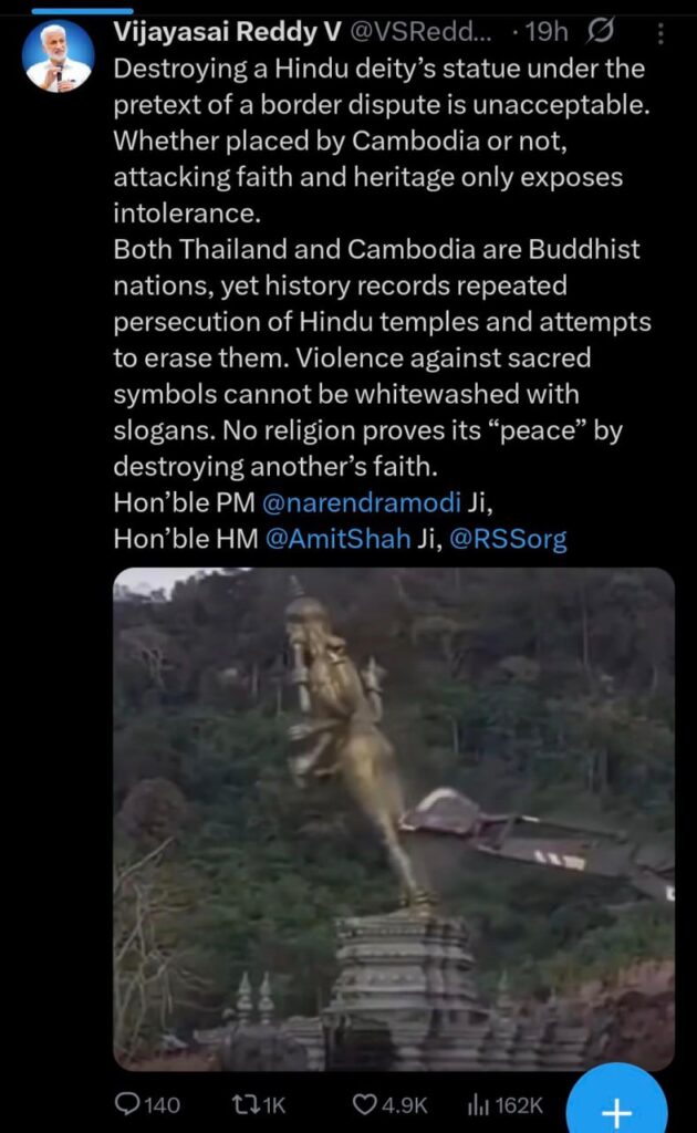 តាមរយៈការបង្ហោះ នៅលើបណ្តាញសង្គម X, លោក Vijayasai Reddy V រៀបរាប់ថា «ការបំផ្លាញរូបសំណាកអាទិទេពហិណ្ឌូ ក្រោមលេសនៃជម្លោះព្រំដែន គឺមិនអាចទទួលយកបាន និងមិនសមហេតុផលទាល់តែសោះ» ។