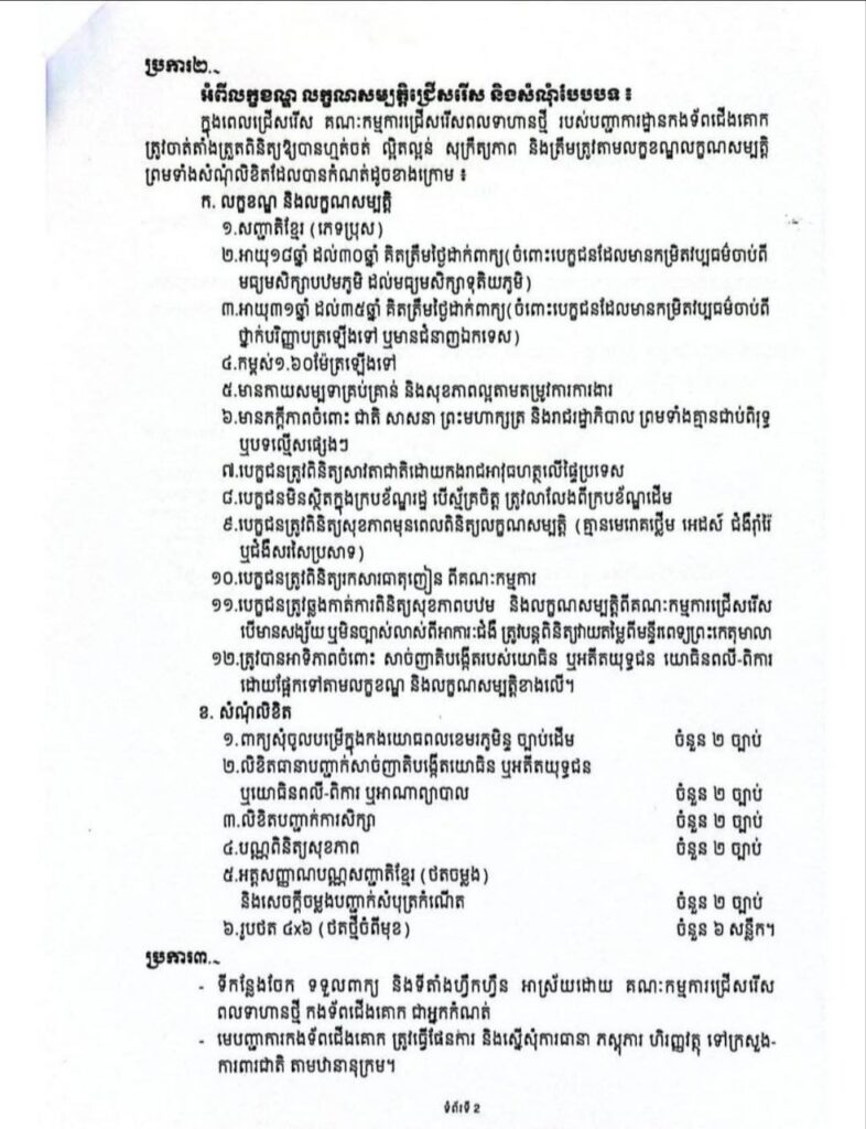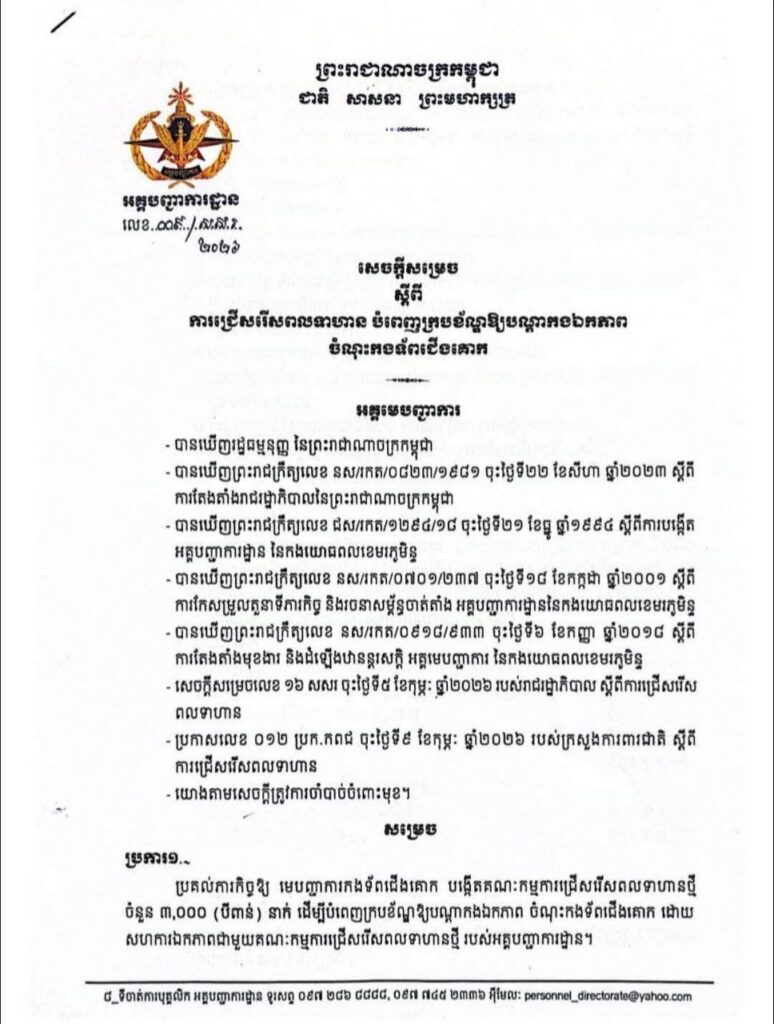 ក្រសួងការពារជាតិ សម្រេច ជ្រើសរើសពលទាហានថ្មី ៣០០០នាក់បន្ថែម