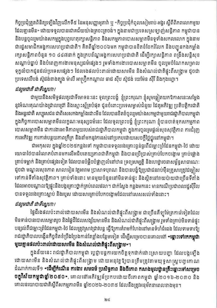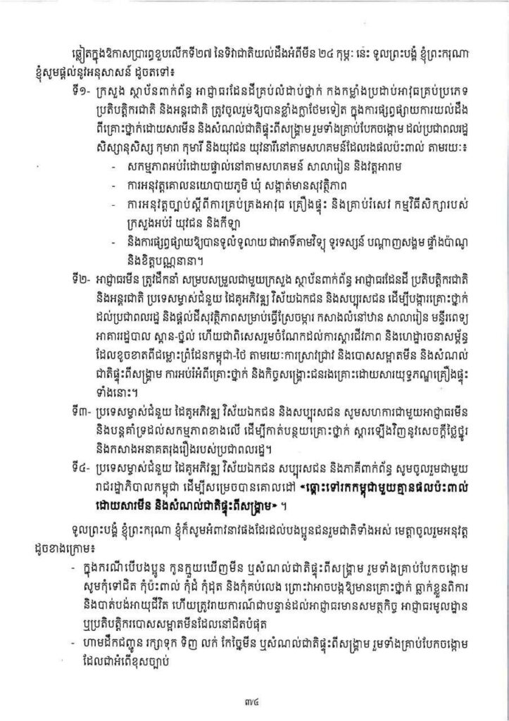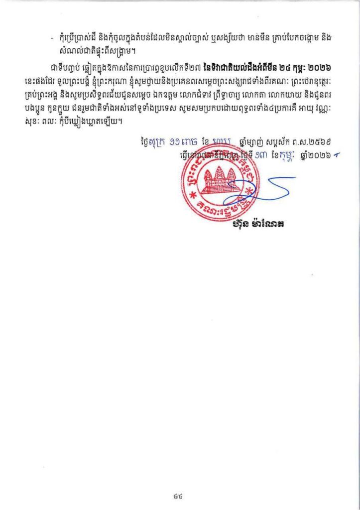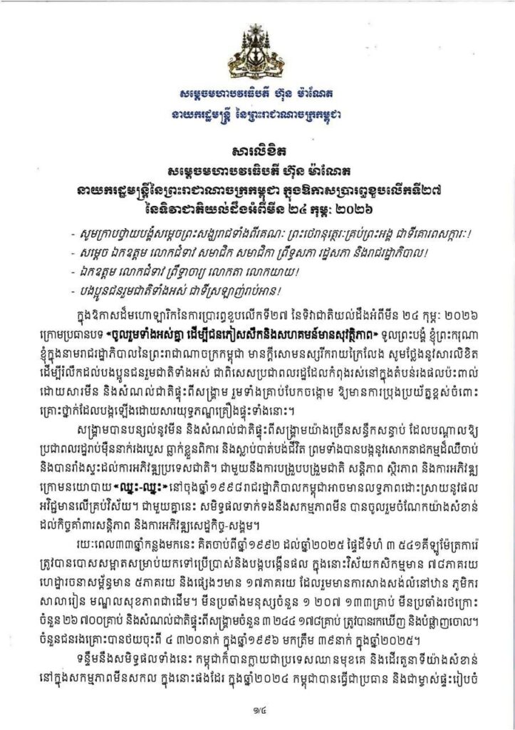 សារលិខិត សម្តេចមហាបវរធិបតី ហ៊ុន ម៉ាណែត នាយករដ្ឋមន្ត្រីនៃព្រះរាជាណាចក្រកម្ពុជា ក្នុងឱកាសប្រារព្ធខួបលេីកទី២៧ នៃទិវាជាតិយល់ដឹងអំពីមីន ២៤ កុម្ភៈ ២០២៦