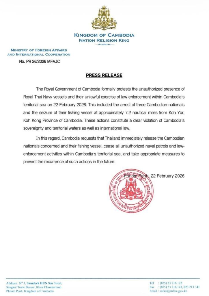 ក្នុងសេចក្តីប្រកាសព័ត៌មានចេញផ្សាយដោយក្រសួងការបរទេស និងសហប្រតិបត្តិការអន្តរជាតិ កាលពីថ្ងៃទី ២២ ខែកុម្ភៈ បានឲ្យដឹងថា ហេតុការណ៍នេះបានកើតឡើងនៅថ្ងៃដដែល ខណៈកម្លាំងជើងទឹកថៃបានអះអាងថា បានអនុវត្តវិធានការនីតីវិធីថៃនៅក្នុងដែនសមុទ្ររបស់កម្ពុជា និងរំលោភច្បាប់អន្តរជាតិ។