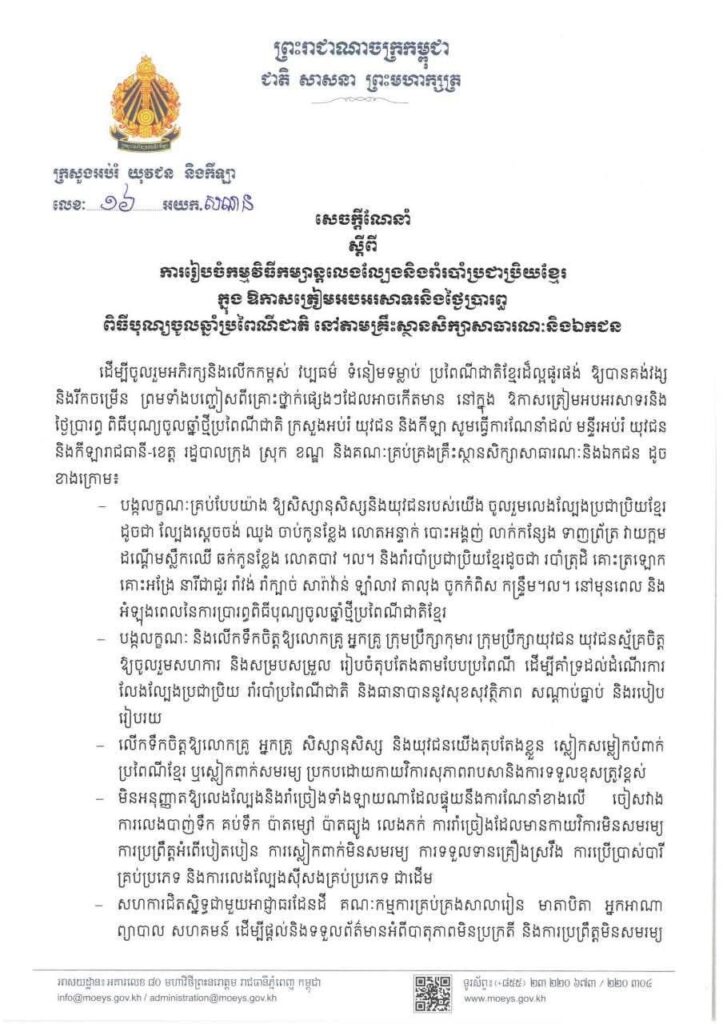 ក្រសួងអប់រំ មិនអនុញ្ញាតឱ្យលេងល្បែង និងរាំច្រៀងទាំងឡាយណា មិនសមរម្យ ក្នុងឱកាសត្រៀមអបអរសាទរពិធីបុណ្យចូលឆ្នាំខ្មែរ នៅតាមគ្រឹះស្ថានសិក្សា