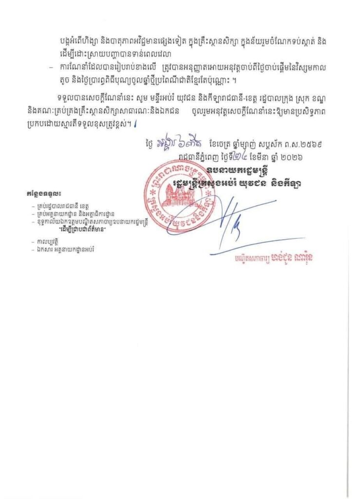 យោងតាមសេចក្ដីណែនាំរបស់ ក្រសួងអប់រំ នាថ្ងៃទី២៤ ខែមីនា ឆ្នាំ២០២៦ ក្រសួង បានធ្វើការណែនាំដល់មន្ទីរអប់រំ យុវជន និងកីឡារាជធានី-ខេត្ត រដ្ឋបាលក្រុង ស្រុក ខណ្ឌ និងគណៈគ្រប់គ្រងគ្រឹះស្ថានសិក្សាសាធារណៈ និងឯកជន ត្រូវបង្កលក្ខណៈ និងលើកទឹកចិត្តឱ្យលោកគ្រូ អ្នកគ្រូ ក្រុមប្រឹក្សាកុមារ ក្រុមប្រឹក្សាយុវជន យុវជនស្ម័គ្រចិត្ត ឱ្យចូលរួមសហការ និងសម្របសម្រួល រៀបចំតុបតែងតាមបែបប្រពៃណី ដើម្បីគាំទ្រដល់ដំណើរការ លែងល្បែងប្រជាប្រិយ រាំរបាំប្រពៃណីជាតិ និងធានាបាននូវសុខសុវត្ថិភាព សណ្តាប់ធ្នាប់ និងរបៀប រៀបរយ។