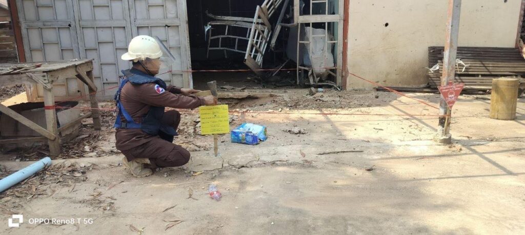 «ហាមប៉ះពាល់គ្រាប់យុទ្ធភណ្ឌមិនទាន់ផ្ទុះ ឃើញនៅកន្លែងណា ដាក់សញ្ញាសម្គាល់ និងរាយការណ៍ជូនអាជ្ញាធរមូលដ្ឋាន ឬមន្ត្រីប៉ូលិស ឬមន្ត្រីCMAC ដែលនៅជិតបំផុត»។