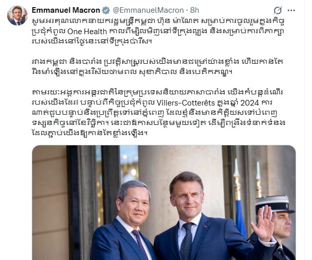 លោកបានសរសេរកាលពីយប់មិញម៉ោងនៅកម្ពុជាជាភាសាខ្មែរថា៖ «សូមអរគុណលោកនាយករដ្ឋមន្ត្រីកម្ពុជា ហ៊ុន ម៉ាណែត សម្រាប់ការចូលរួមក្នុងកិច្ចប្រជុំកំពូល One Health កាលពីម្សិលមិញនៅទីក្រុងល្យុង និងសម្រាប់ការពិភាក្សារបស់យើងនៅថ្ងៃនេះនៅទីក្រុងប៉ារីស។ រវាងកម្ពុជា និងបារាំង ប្រវត្តិសាស្ត្ររបស់យើងមានជម្រៅយ៉ាងខ្លាំង ហើយកាន់តែរឹងមាំឡើងនៅក្នុងវិស័យថាមពល សុខាភិបាល និងបេតិកភណ្ឌ»។