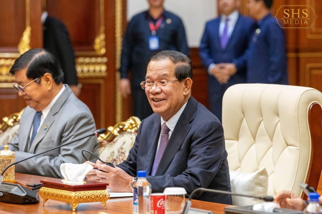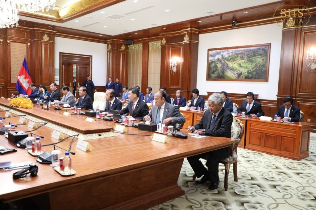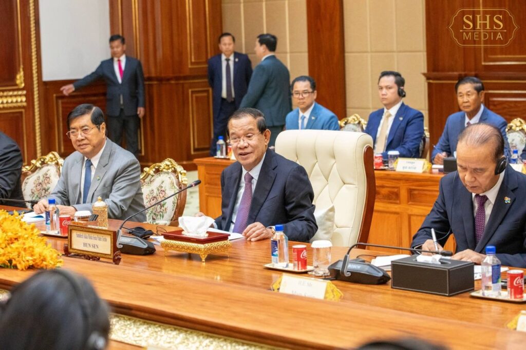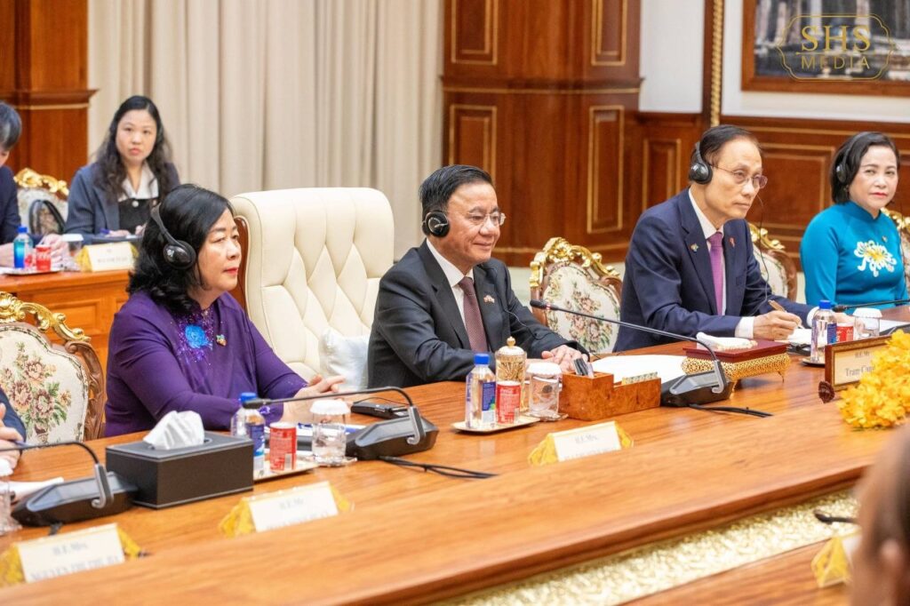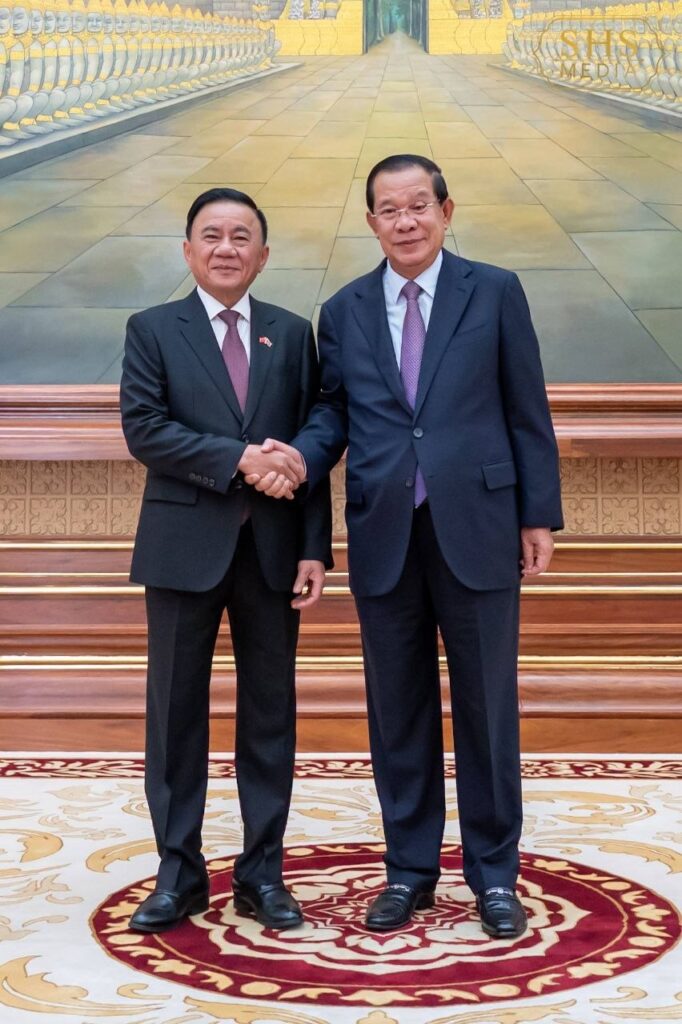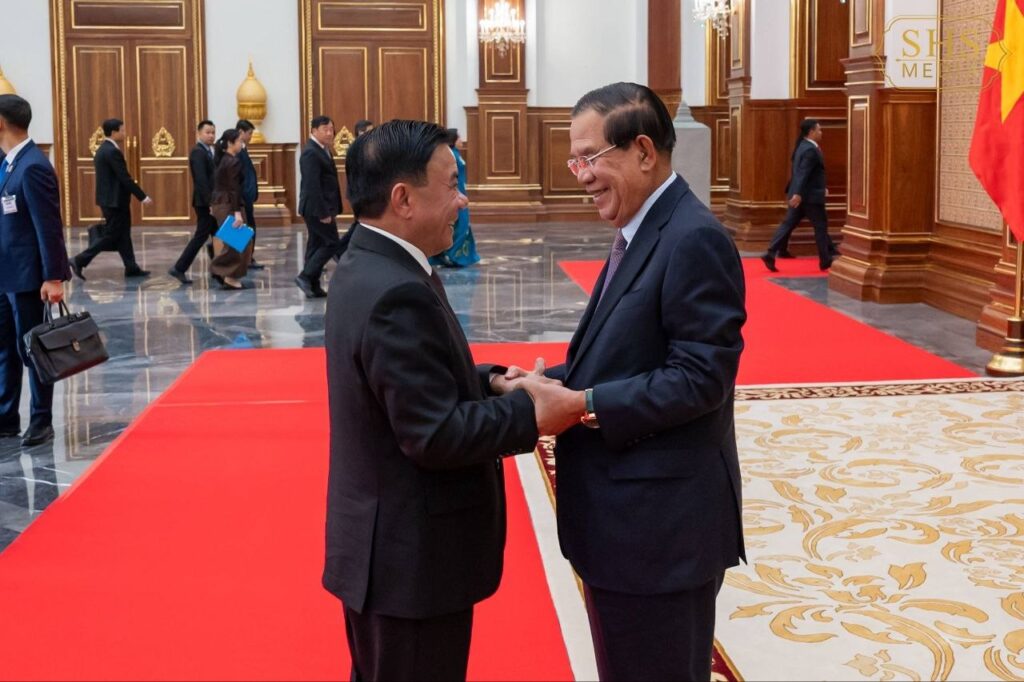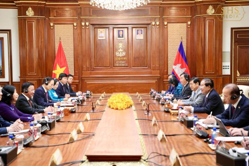 សម្តេចអគ្គមហាសេនាបតីតេជោ ហ៊ុន សែន ប្រមុខរដ្ឋស្តីទីនៃព្រះរាជា ណាចក្រកម្ពុជា និងជាប្រធានគណបក្ស ប្រជាជនកម្ពុជា អនុញ្ញាតឱ្យ ឯកឧត្តម ត្រិន កឹមទូ (Tran Cam Tu) សមាជិកការិយាល័យនយោបាយ និងជាសមាជិកប្រចាំការ គណៈលេខាធិការមជ្ឈិមបក្សកុម្មុយនីស្តវៀតណាម ចូលជួបសម្ដែងការគួរសម នៅវិមានសាមគ្គីភាពនៃព្រឹទ្ធសភាជាតិ រាជធានីភ្នំពេញ។ អត្ថបទដោយ៖ cambodia-nation-media