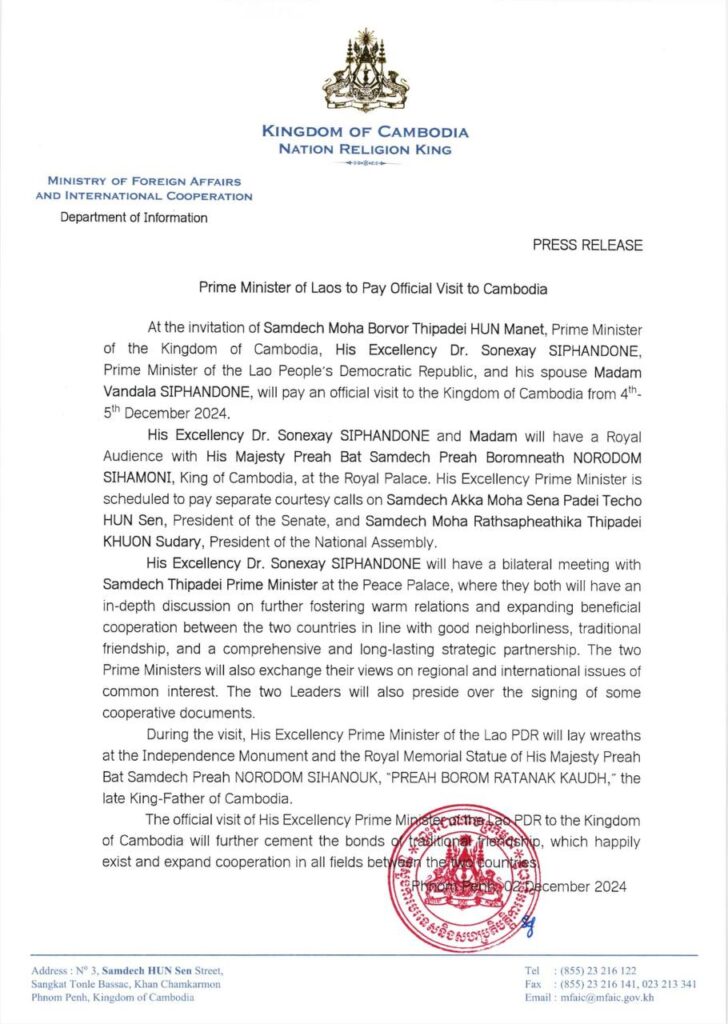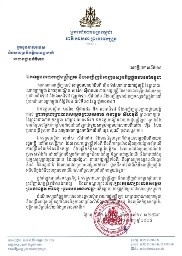 នាយករដ្ឋមន្ត្រីឡាវ និងលោកជំទាវ អញ្ជើញមកដល់រាជធានីភ្នំពេញ ក្នុងដំណើរទស្សនកិច្ចផ្លូវការចំនួន០២ថ្ងៃ