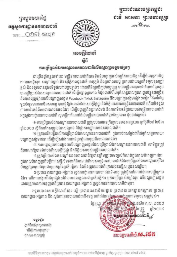 អគ្គស្នងការនគរបាលជាតិ៖ ការបង្ហោះរូបភាពផ្សេងៗលើបណ្តាញសង្គមដែលប្រើប្រាស់ឯកសណ្ឋាននគរបាលជាតិ សាមីខ្លួនត្រូវ ពិចារណាឱ្យបានម៉ត់ចត់ពីសេចក្តីថ្លៃថ្នូរ និងកិត្តិយសរបស់មន្ត្រីនគរបាលជាតិ។