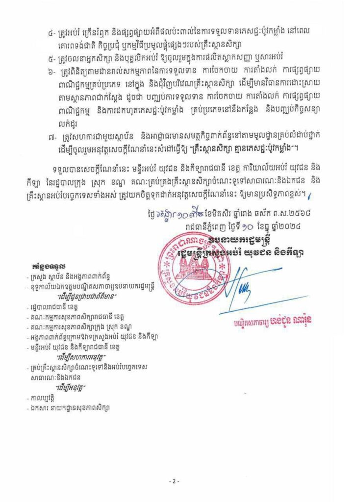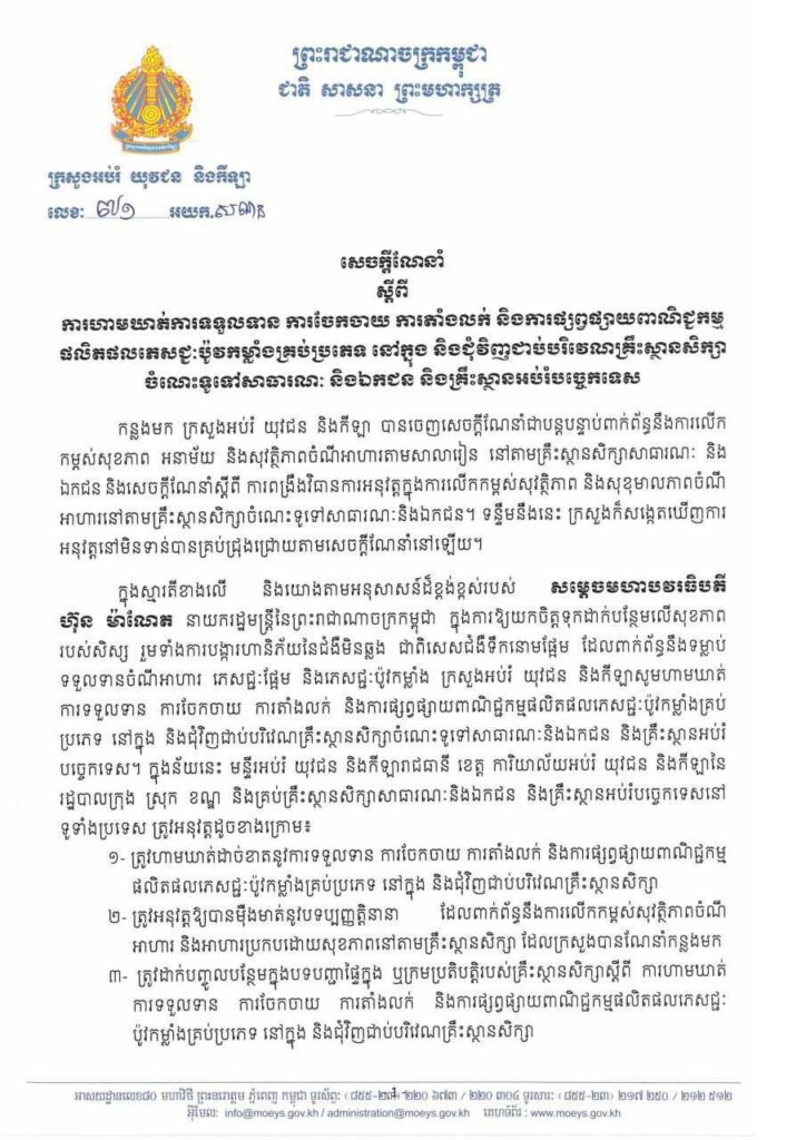 ក្រសួងអប់រំ សម្រេចហាមឃាត់ការទទួលទាន ការចែកចាយ ការតាំងលក់ និងការផ្សព្វផ្សាយពាណិជ្ជកម្ម ផលិតផលភេសជ្ជៈប៉ូវកម្លាំងគ្រប់ប្រភេទ នៅក្នុង និងជុំវិញជាប់បរិវេណគ្រឹះស្ថានសិក្សា ចំណេះទូទៅសាធារណៈ និងឯកជន និងគ្រឹះស្ថានអប់រំបច្ចេកទេស