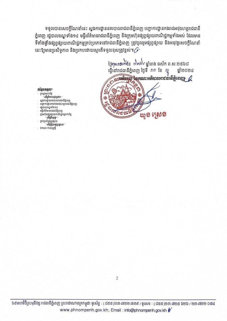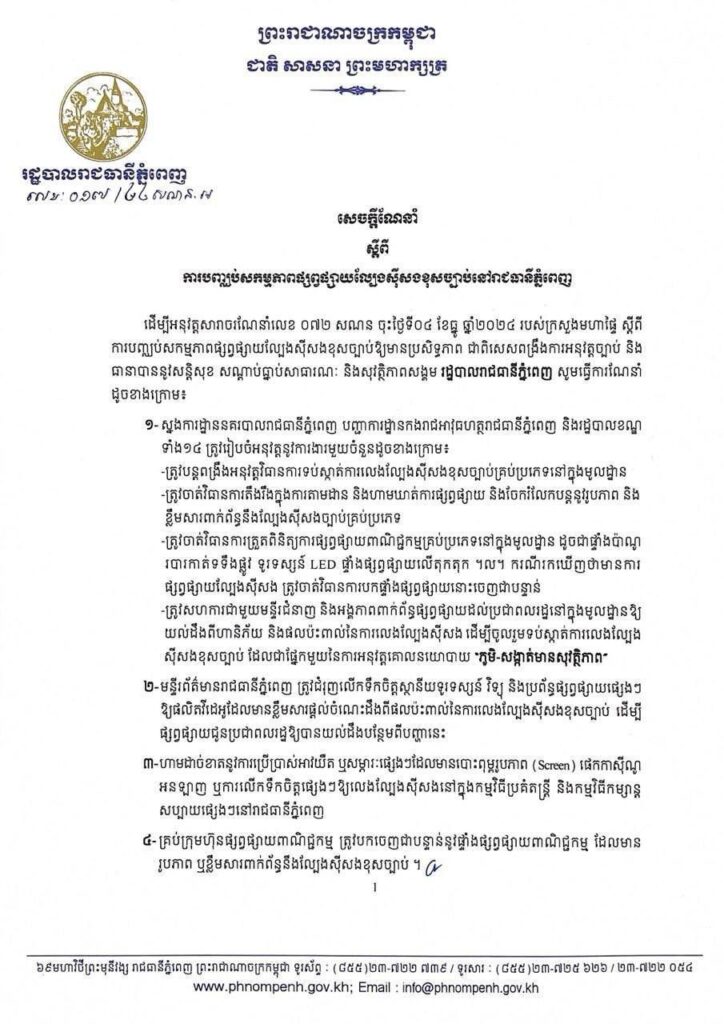 សេចក្តីណែនាំស្តីពីការបញ្ឈប់សកម្មភាពផ្សព្វផ្សាយល្បែងស៊ីសងខុសច្បាប់ នៅក្នុងភូមិសាស្រ្តរាជធានីភ្នំពេញ។