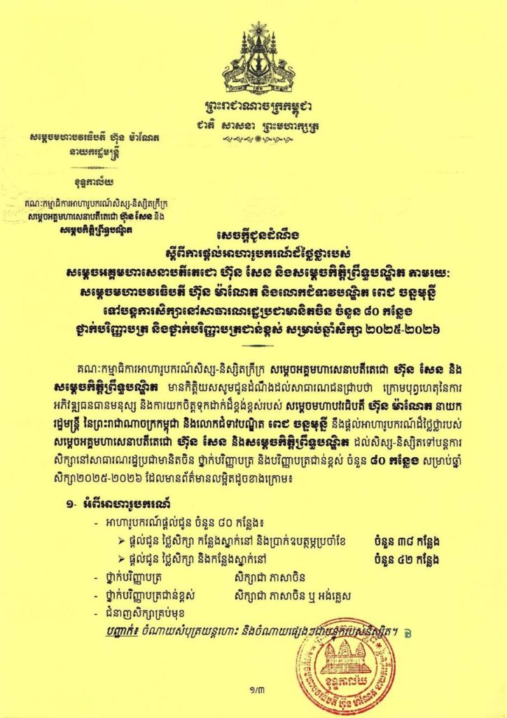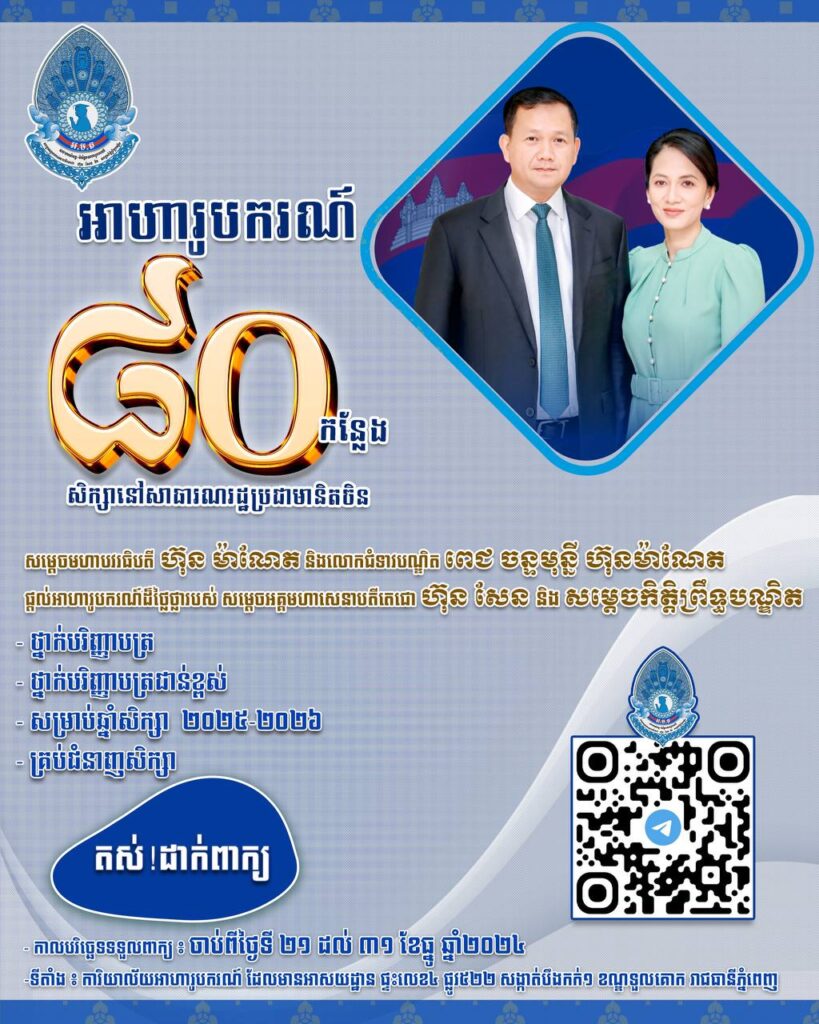 សម្តេចមហាបវរធិបតី ហ៊ុន ម៉ាណែត និងលោកជំទាវបណ្ឌិត ពេជ ចន្ទមុន្នី ហ៊ុនម៉ាណែត ផ្តល់អាហារូបករណ៍ដ៏ថ្លៃថ្លារបស់ សម្តេចអគ្គមហាសេនាបតីតេជោ ហ៊ុន សែន និងសម្តេចកិត្តិព្រឹទ្ធបណ្ឌិត (អ.ម.ត) សិក្សានៅសាធារណរដ្ឋប្រជាមានិតចិន