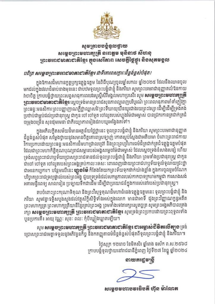 សម្តេចធិបតី ក្រាបបង្គំទូលថ្វាយសារលិខិតថ្វាយជូន សម្តេចព្រះមហាក្សត្រី នរោត្តម មុនិនាថ សីហនុ ព្រះវររាជមាតាជាតិខ្មែរ